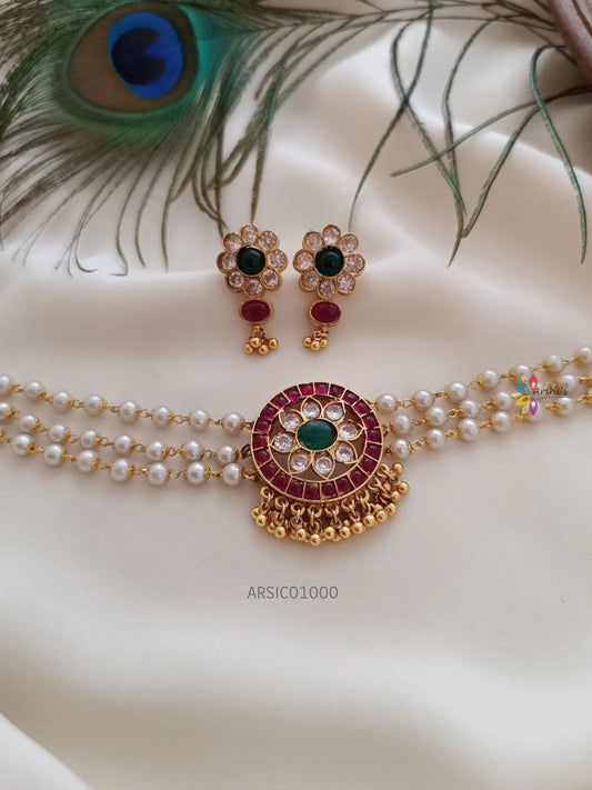 Three Layer Pearl with Stone Pendant Choker