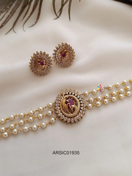 Three Layer Pearl Peacock Red Stone Choker