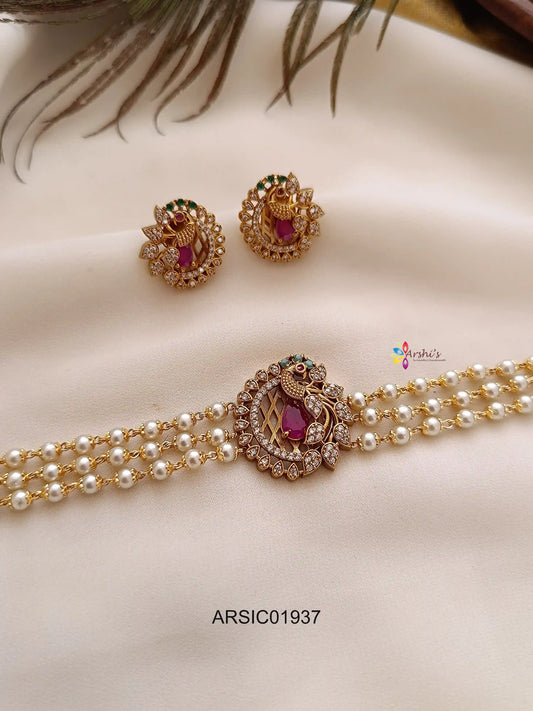 Elegant Three Layer Pearl Peacock Multi Stone Choker