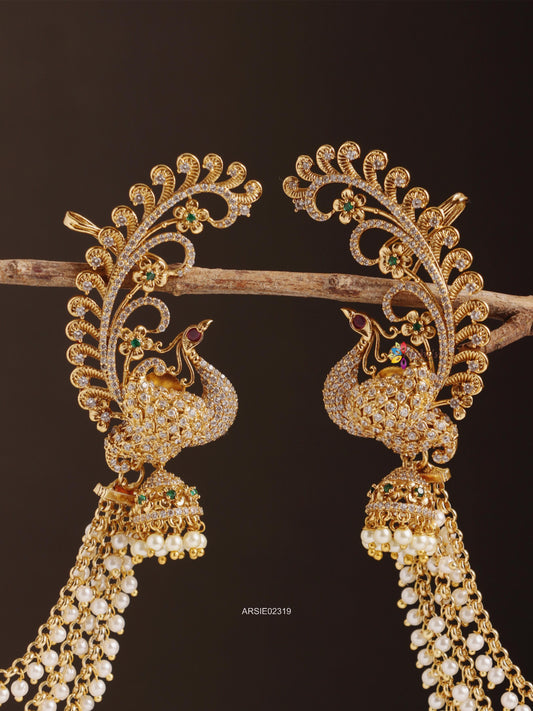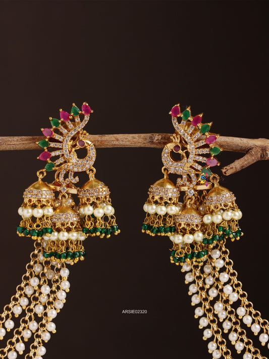 Peacock Triset White Stone Jhumka with Paerl Earchains
