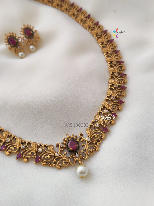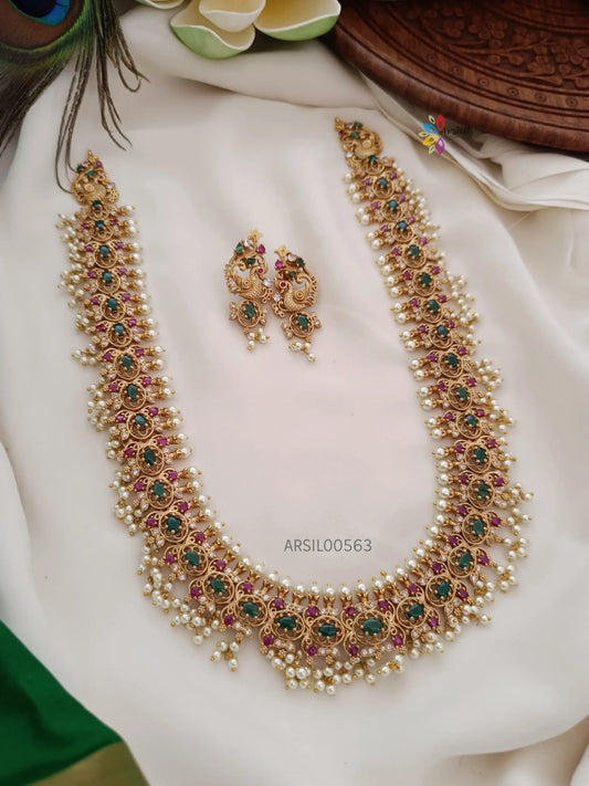 Lakshmi and Peacock Pendant Red and White Stone Haram