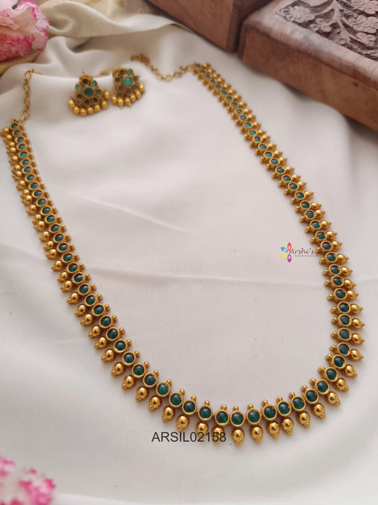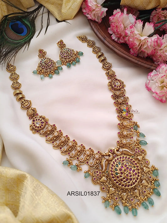 Lotus and Peacock AD Stone Green Bead Long Haram