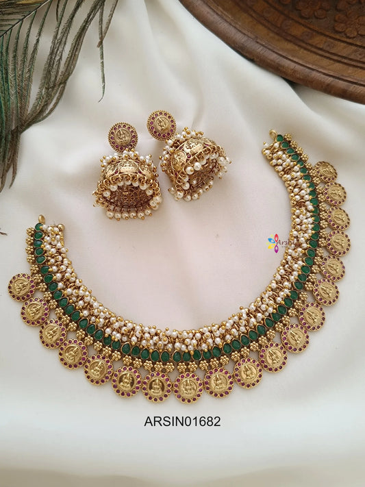 Pearl with Emerald Stone Lakshmi Coin Necklace
