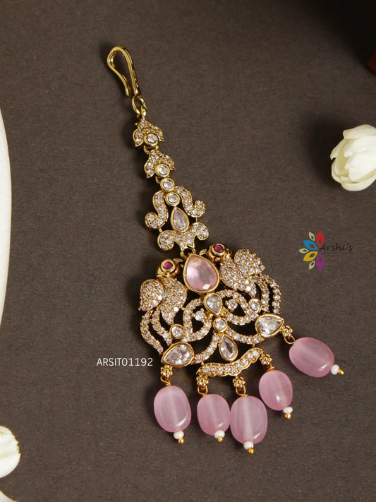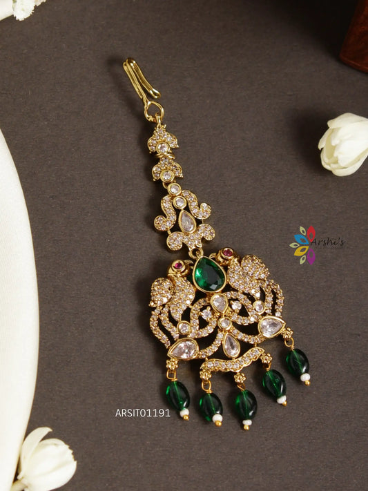 Peacock Kemp Stone Hair Brooch with Gold Bead Chain