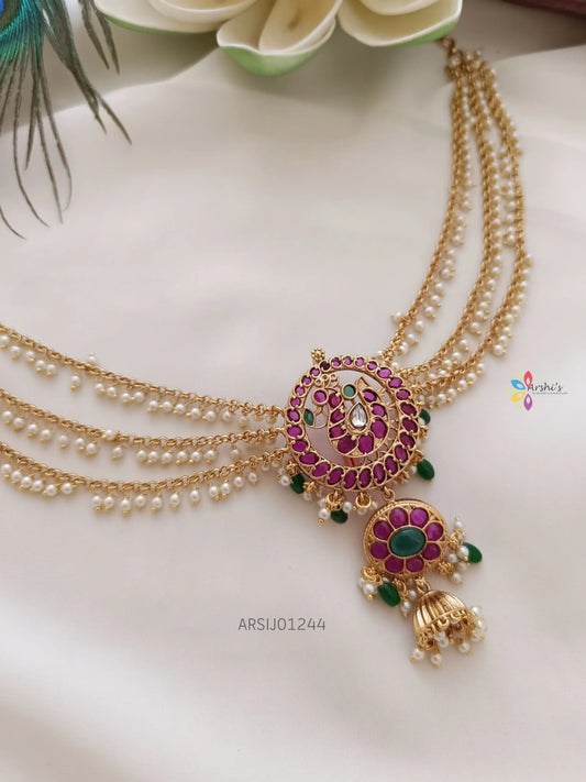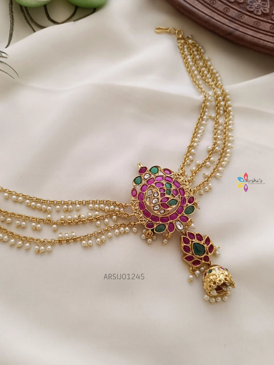 Peacock Kemp Stone Hair Brooch with Pearl Chain