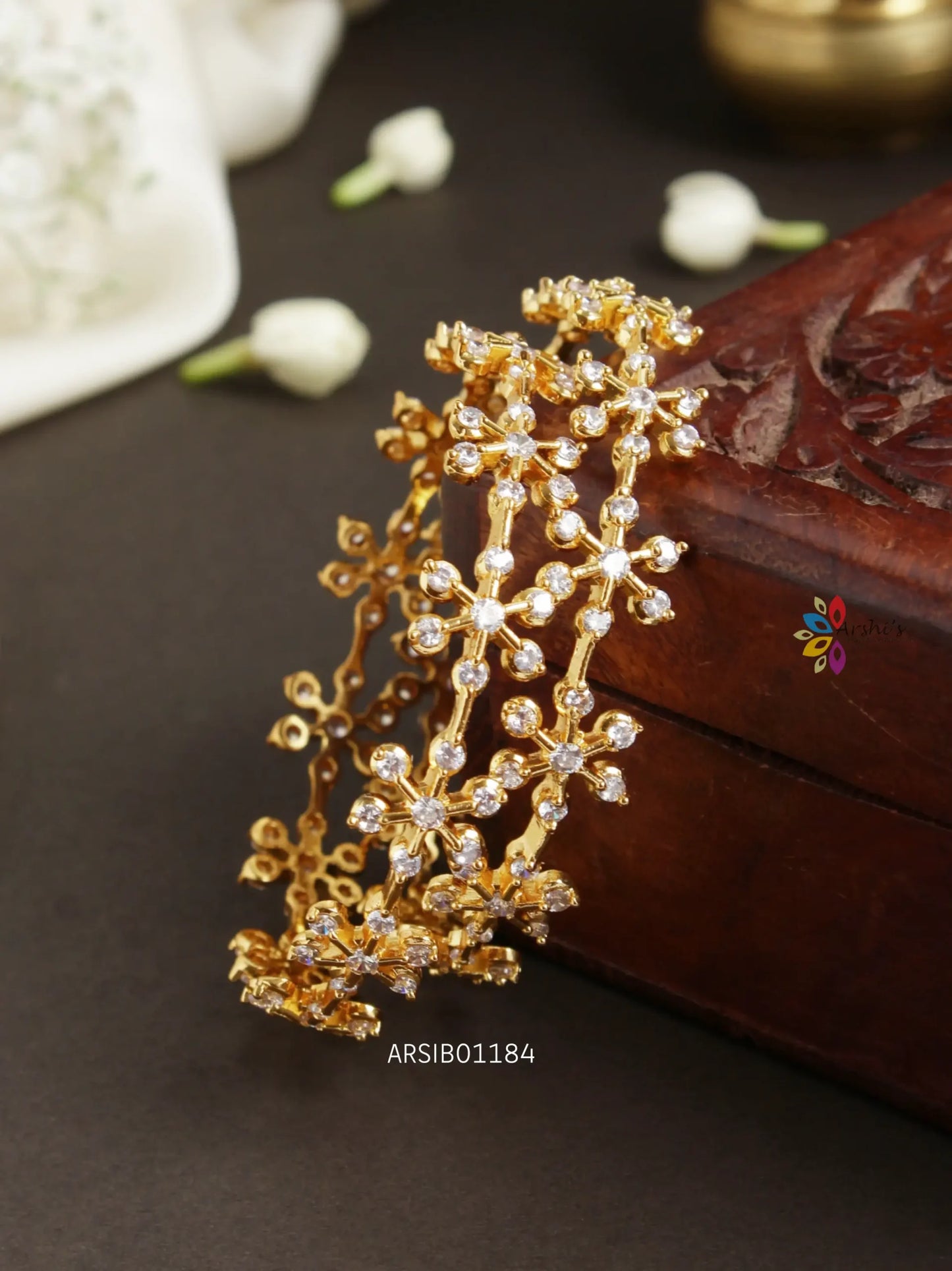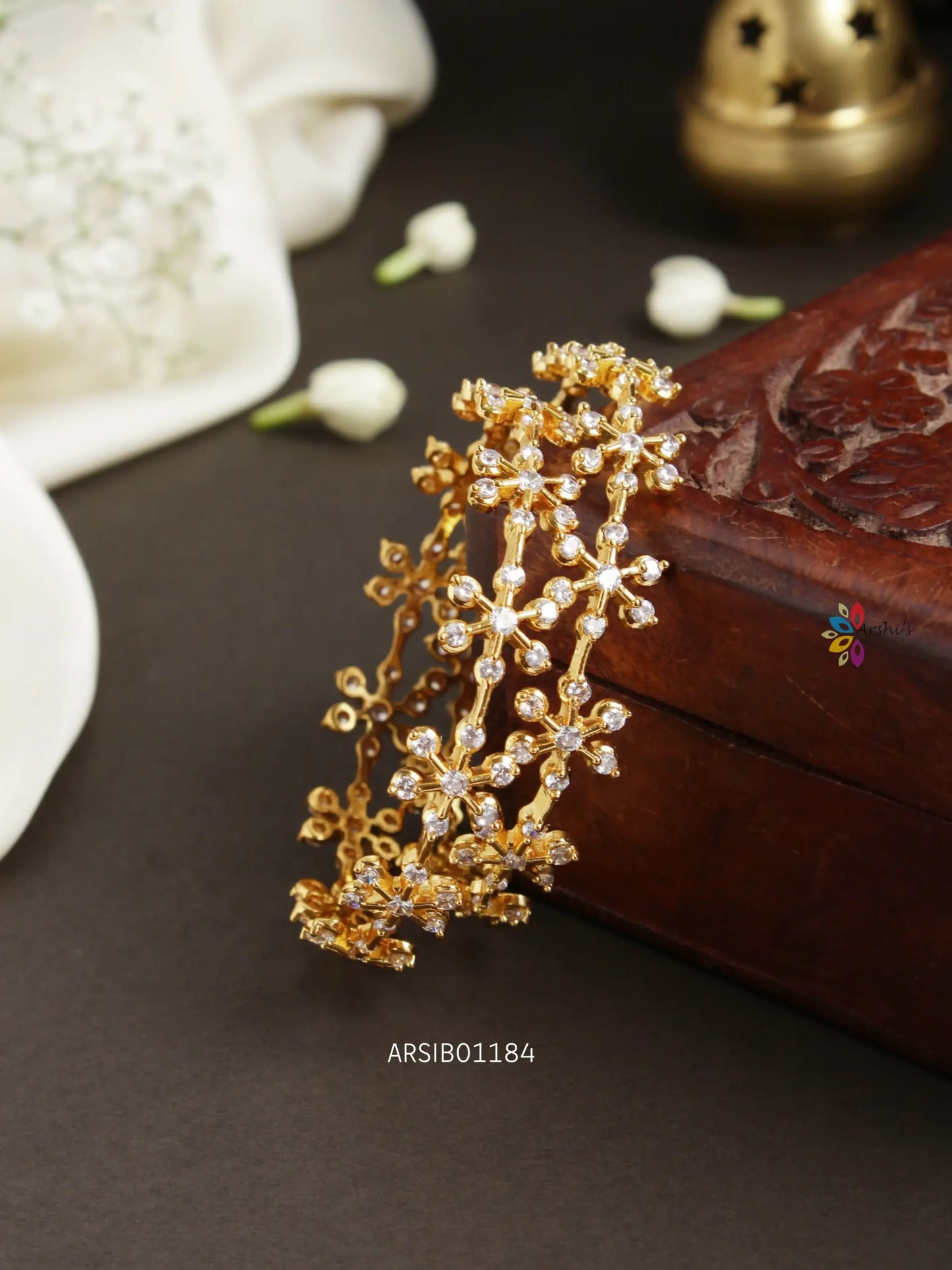 The term AD White Stone Bangles typically refers to bangle bracelets that feature white stones made of American Diamond, which are also known as cubic zirconia or synthetic diamonds.