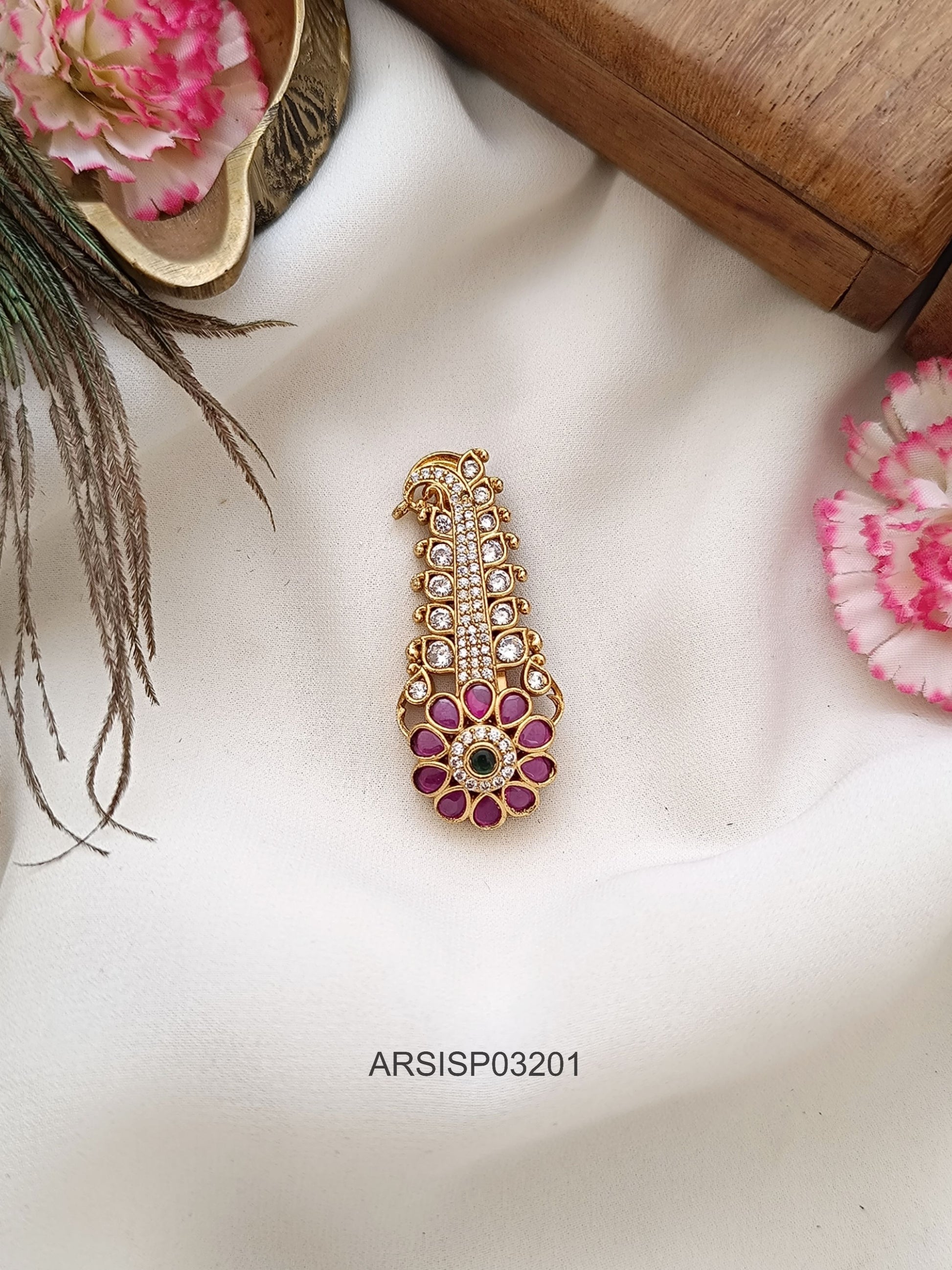 Traditional Andal Kondai saree pin inspired by classical temple motifs, beautifully crafted to secure sarees while adding divine elegance, cultural richness, and a graceful finishing touch to festive and bridal looks.