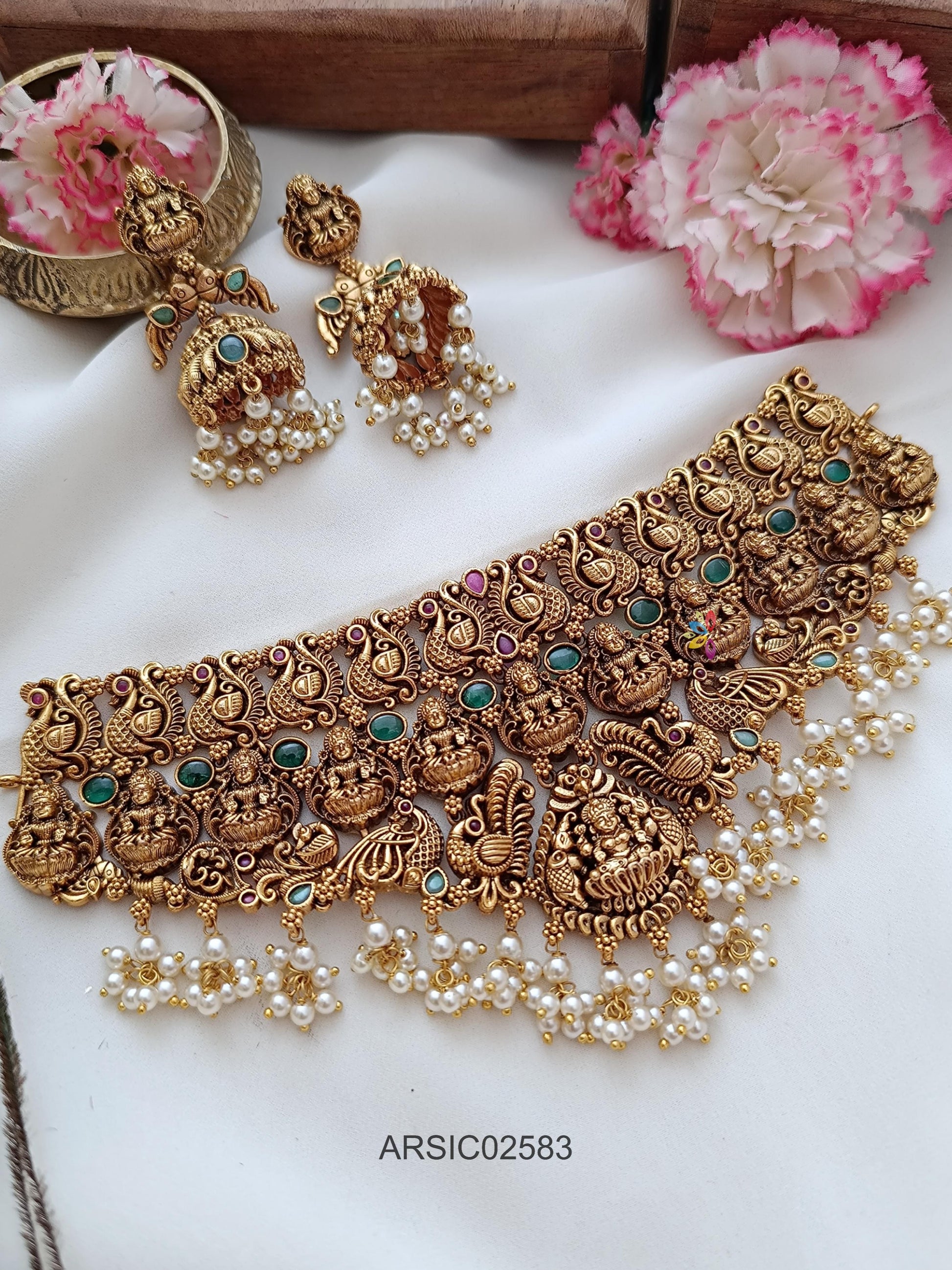 Elegant Antique Flexible Temple Choker with intricate temple motifs and antique finish, blending heritage craftsmanship with comfort—perfect for weddings, festive occasions, and adding timeless South Indian traditional charm to any look.
