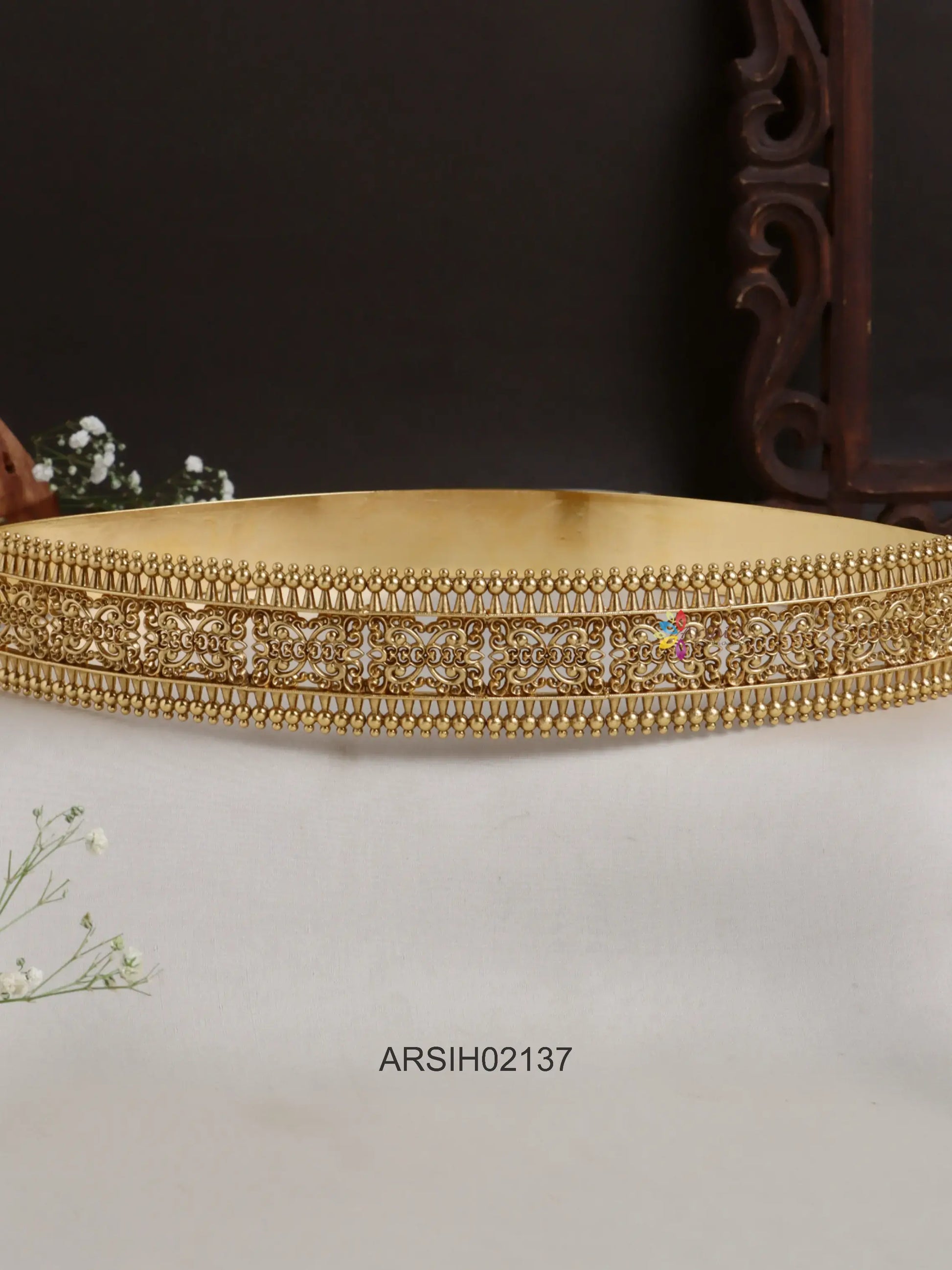 This Antique Jali Hipbelt showcases intricate lattice (jali) work in a traditional antique gold finish. Elegant and regal, it beautifully accentuates ethnic attire, making it perfect for weddings and festive occasions.