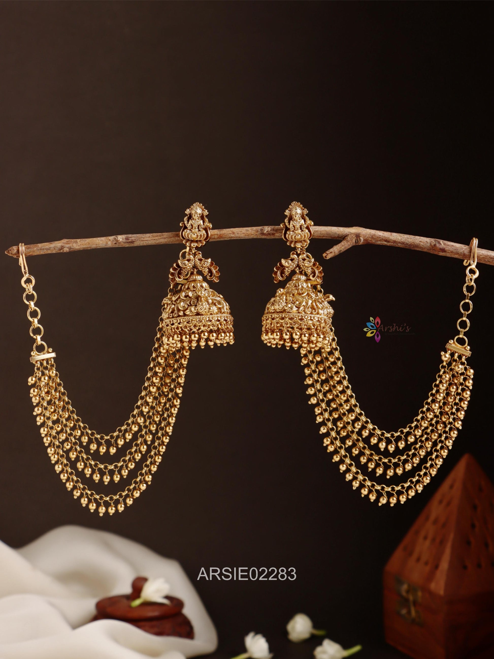 Antique-style Lakshmi gold bead jhumkas with matching earchains, perfect for festive and temple wear. The classic design pairs well with traditional outfits like sarees, lehengas, and half-sarees.