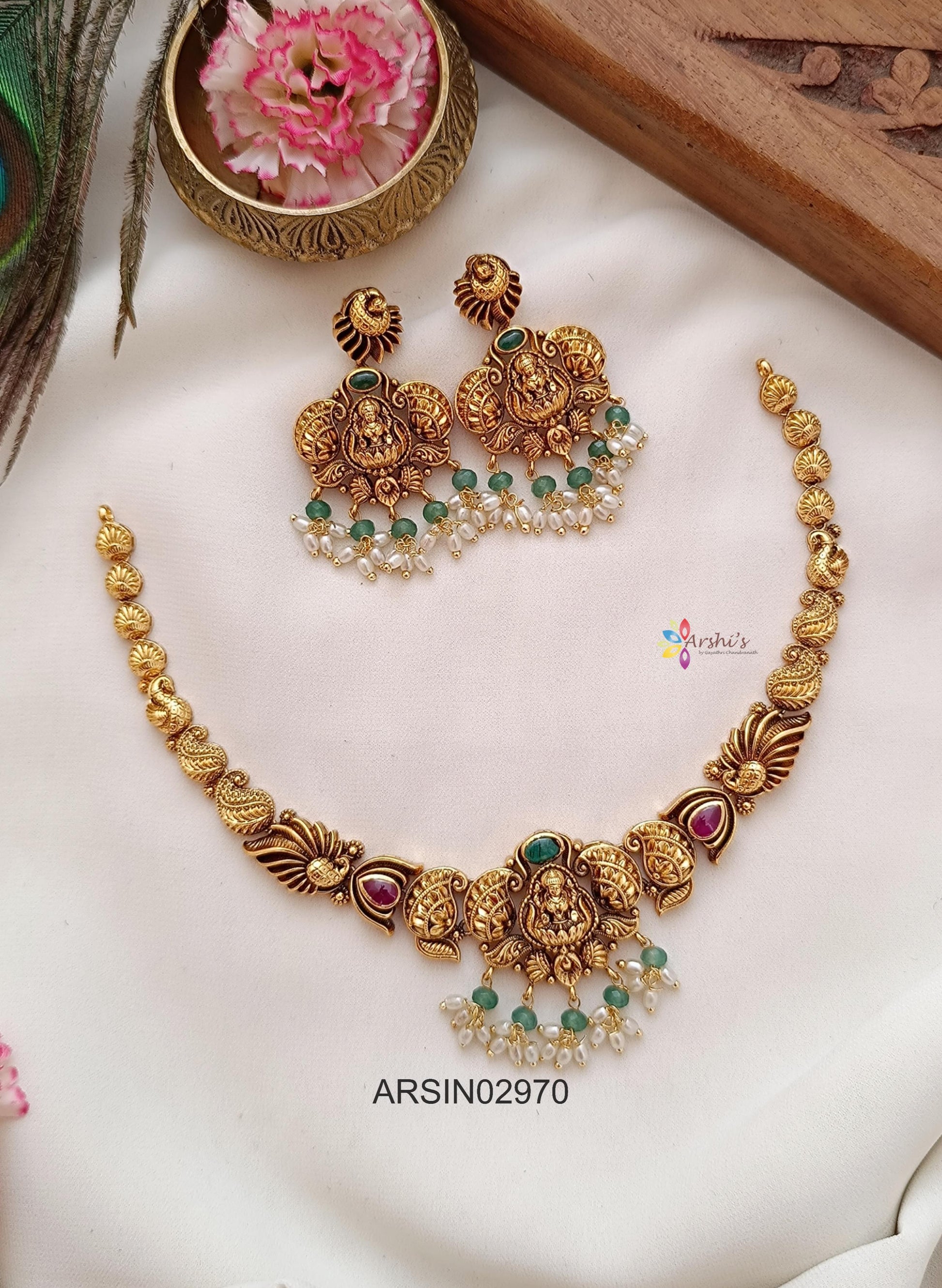 Antique Lakshmi Mango Necklace adorned with a radiant Lakshmi pendant and traditional mango motifs. Its rich antique finish and temple-inspired detailing make it ideal for silk sarees, weddings, and festive traditional looks.