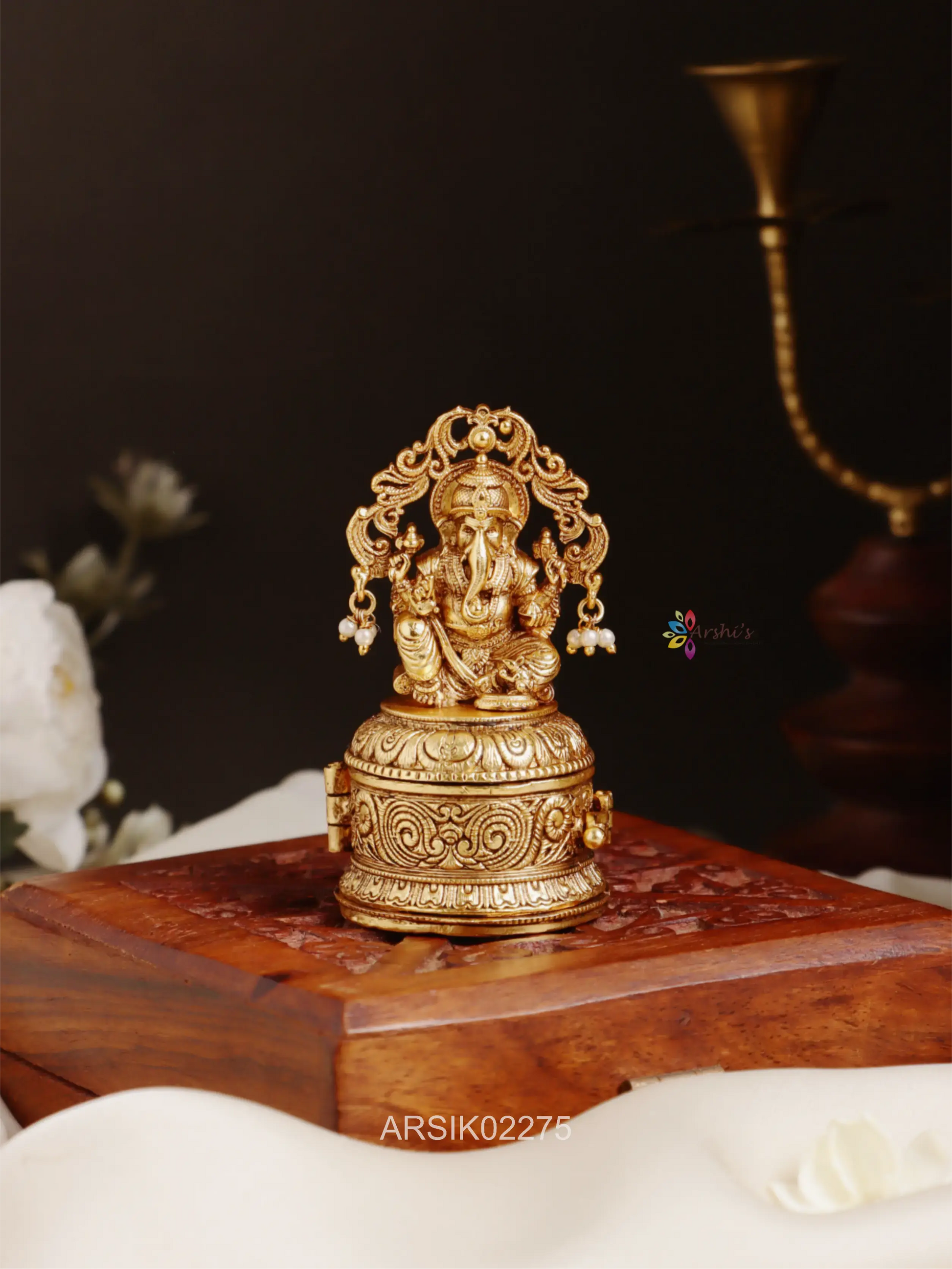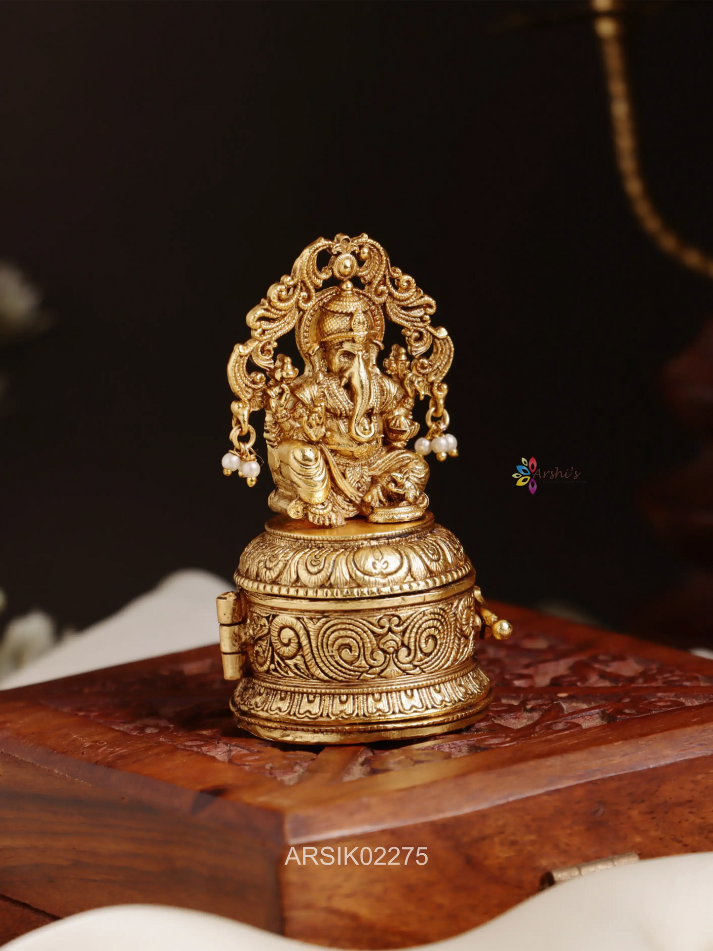 Antique Lord Ganesha Kumkum Box features an image or carving of Lord Ganesha on the lid. It is used for storing kumkum and is suitable for pooja rituals, gifting, and festive occasions.