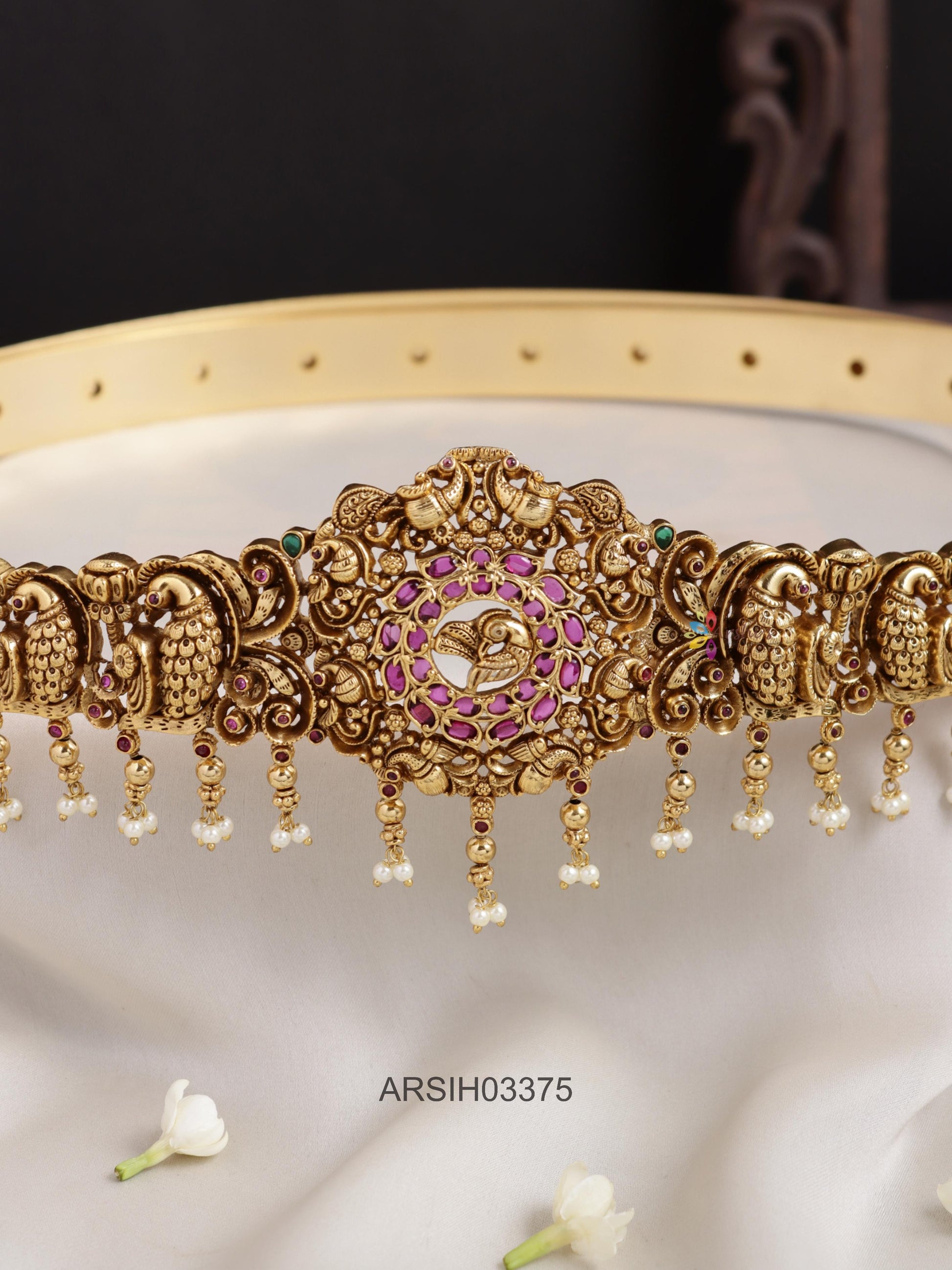 An antique peacock hipbelt showcasing intricately carved peacock motifs and vintage temple detailing, designed to add regal charm, heritage elegance, and traditional grandeur to bridal and festive silk sarees.