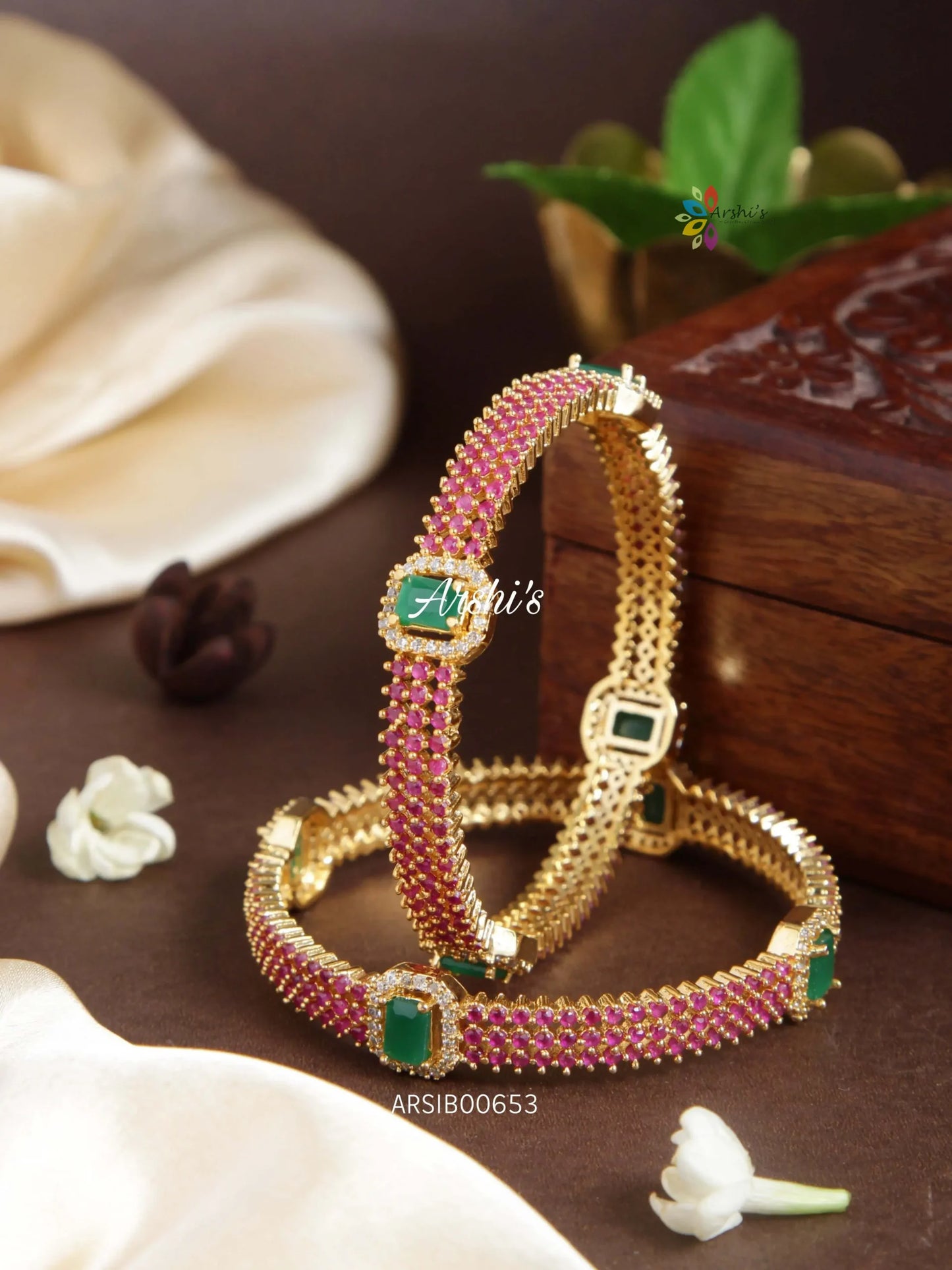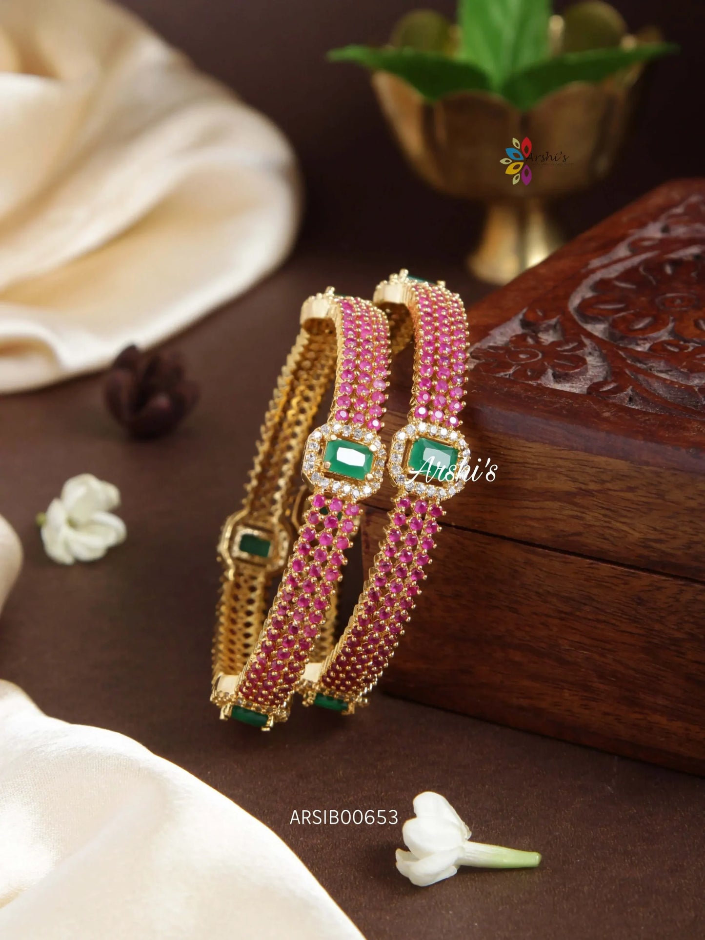 Introducing our Beautiful Ruby and Green AD Bangles, a stunning blend of elegance and vibrancy. Adorned with sparkling ruby and green AD stones, these bangles exude opulence and sophistication.
