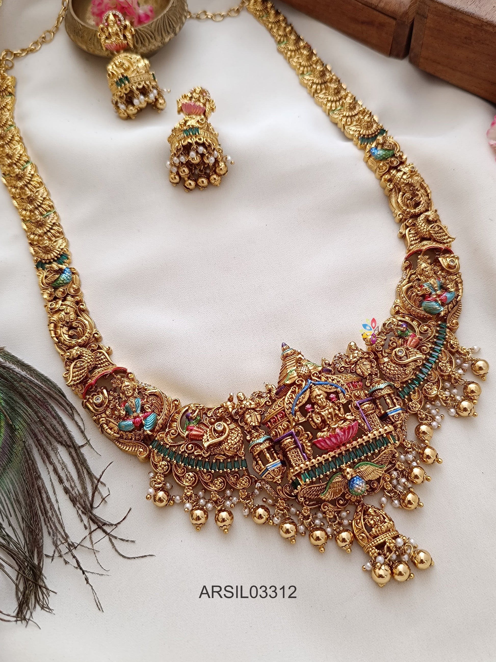 The Bridal Temple Gold Bead Long Haram showcases intricate temple motifs with classic gold bead detailing, creating a rich, regal bridal look—perfect for weddings and pairing with traditional silk sarees.
