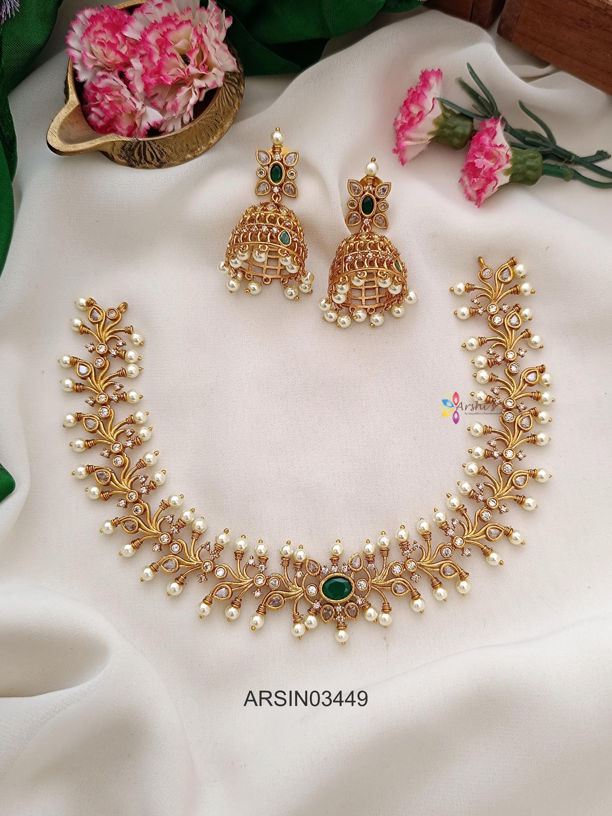 Elegant emerald stone and pearl necklace blending rich green hues with classic white pearls, offering timeless sophistication, graceful charm, and perfect versatility for weddings, festive occasions, and refined traditional styling.