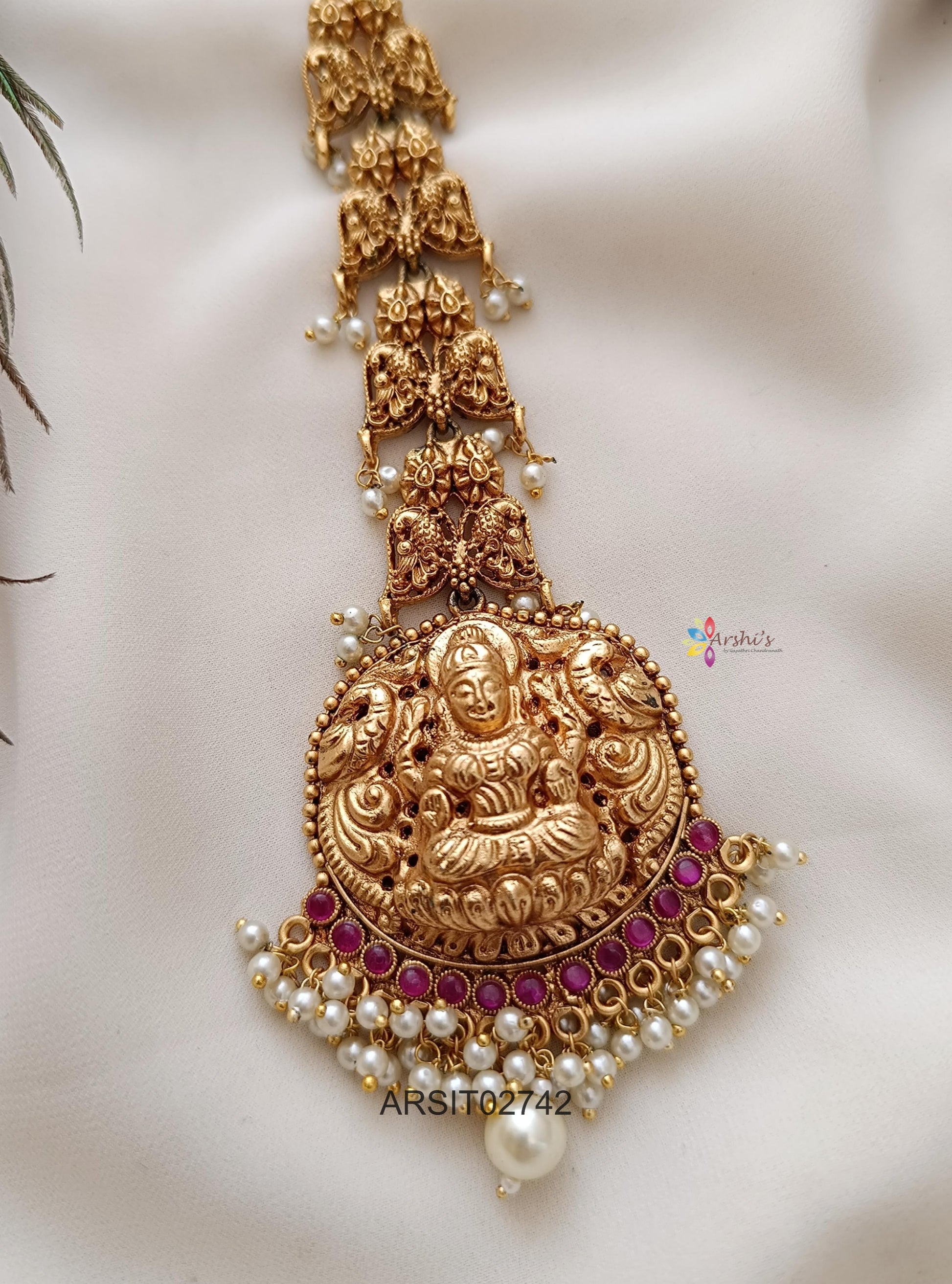 This Goddess Lakshmi Maangtikka features a beautifully detailed Lakshmi motif with intricate craftsmanship. Perfect for weddings, festivals, and traditional occasions, it adds divine charm and auspicious elegance to your ethnic ensemble.