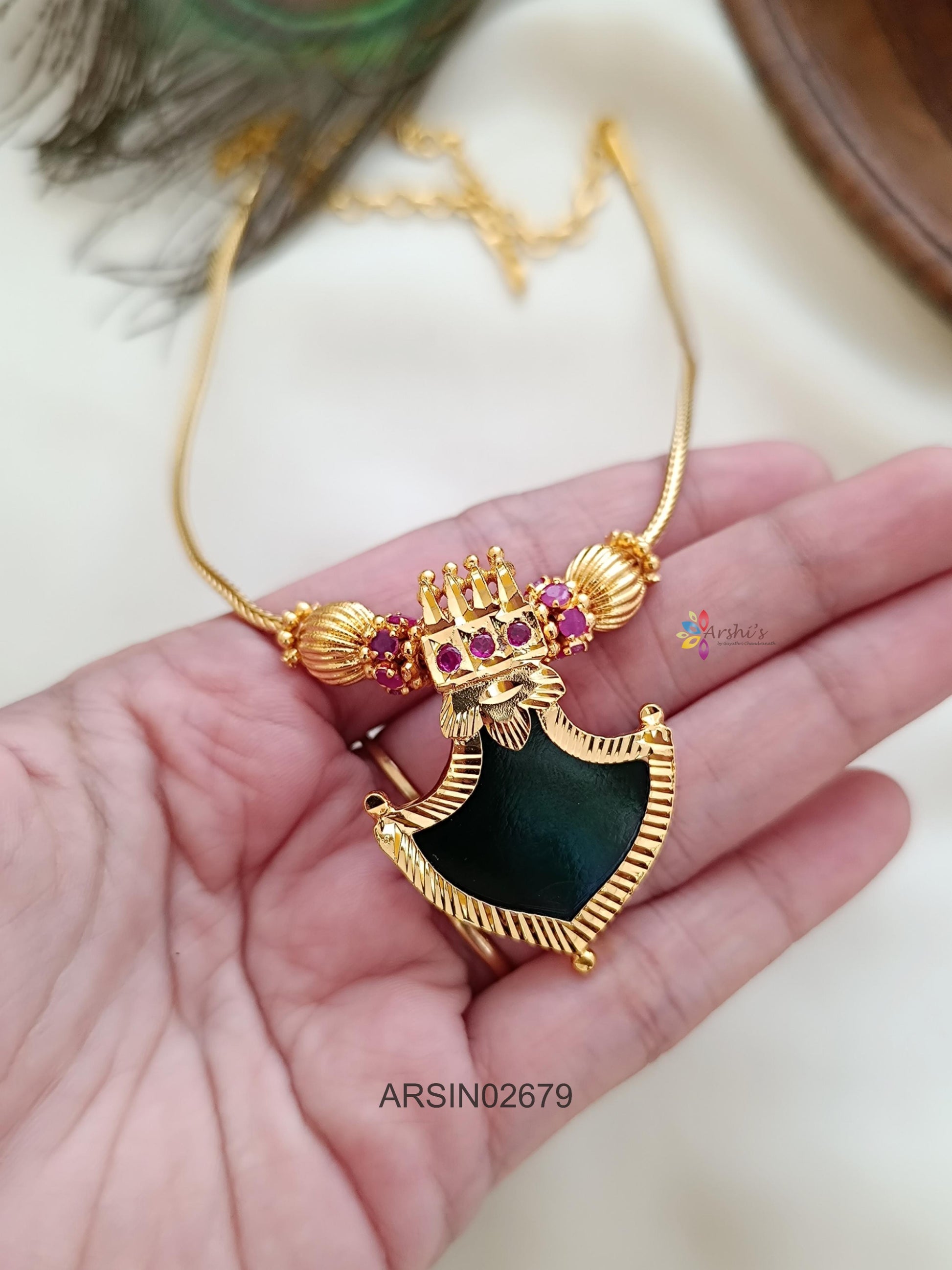The Green Stone Palakka Necklace showcases traditional South Indian elegance with vibrant green stones, intricate leaf motifs, and golden accents—an iconic jewellery piece perfect for weddings, temple visits, and festive celebrations.