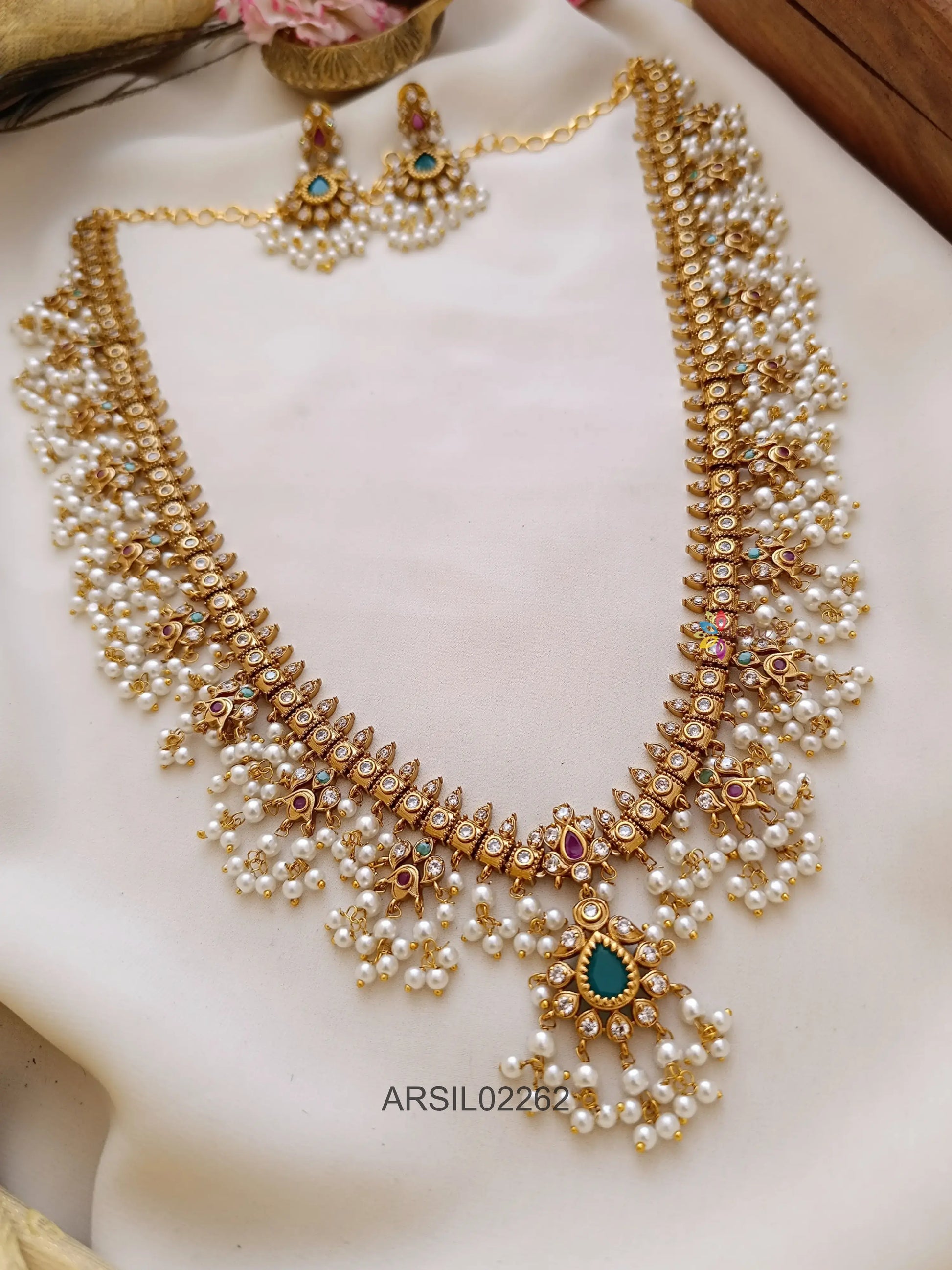 Guttapusalu Emerald Stone Haram features green stones and pearl clusters in a traditional layered design. Suitable for bridal and festive wear, it pairs well with silk sarees and traditional outfits.