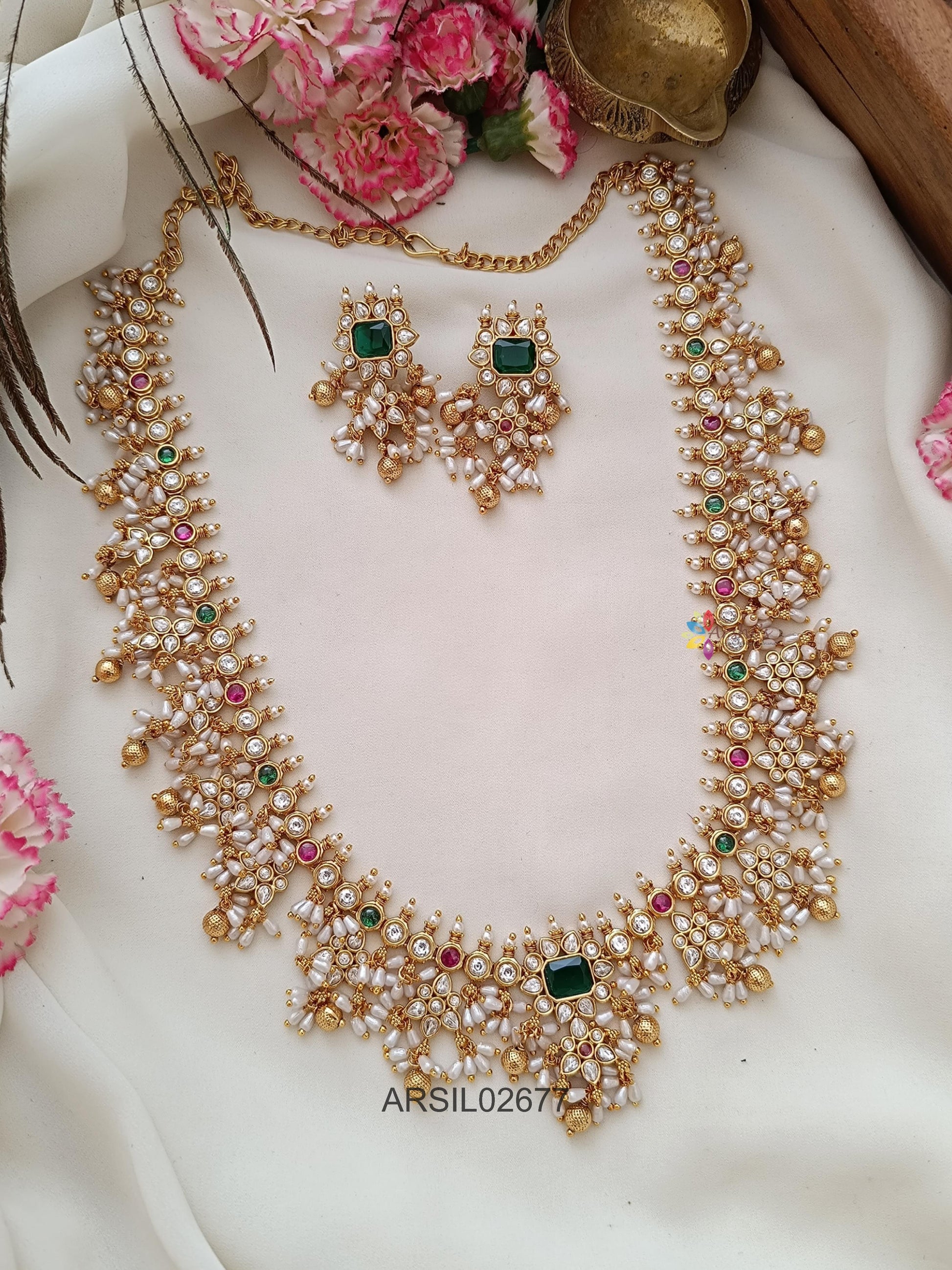 This Guttapusalu Long Haram features traditional gold beads meticulously strung in classic South Indian style. Perfect for weddings and festive occasions, it exudes timeless elegance and adds a rich, ethnic charm to any outfit.