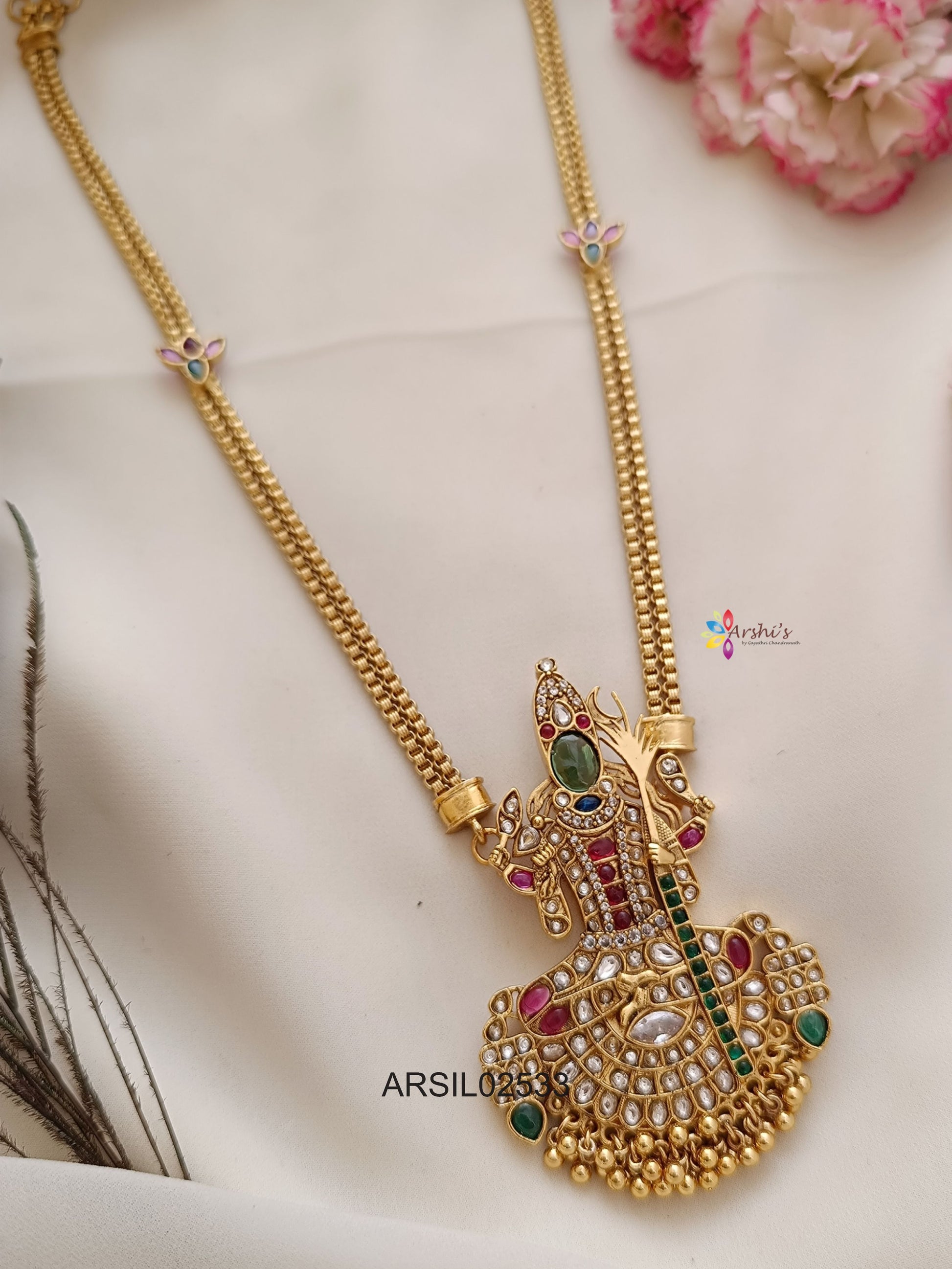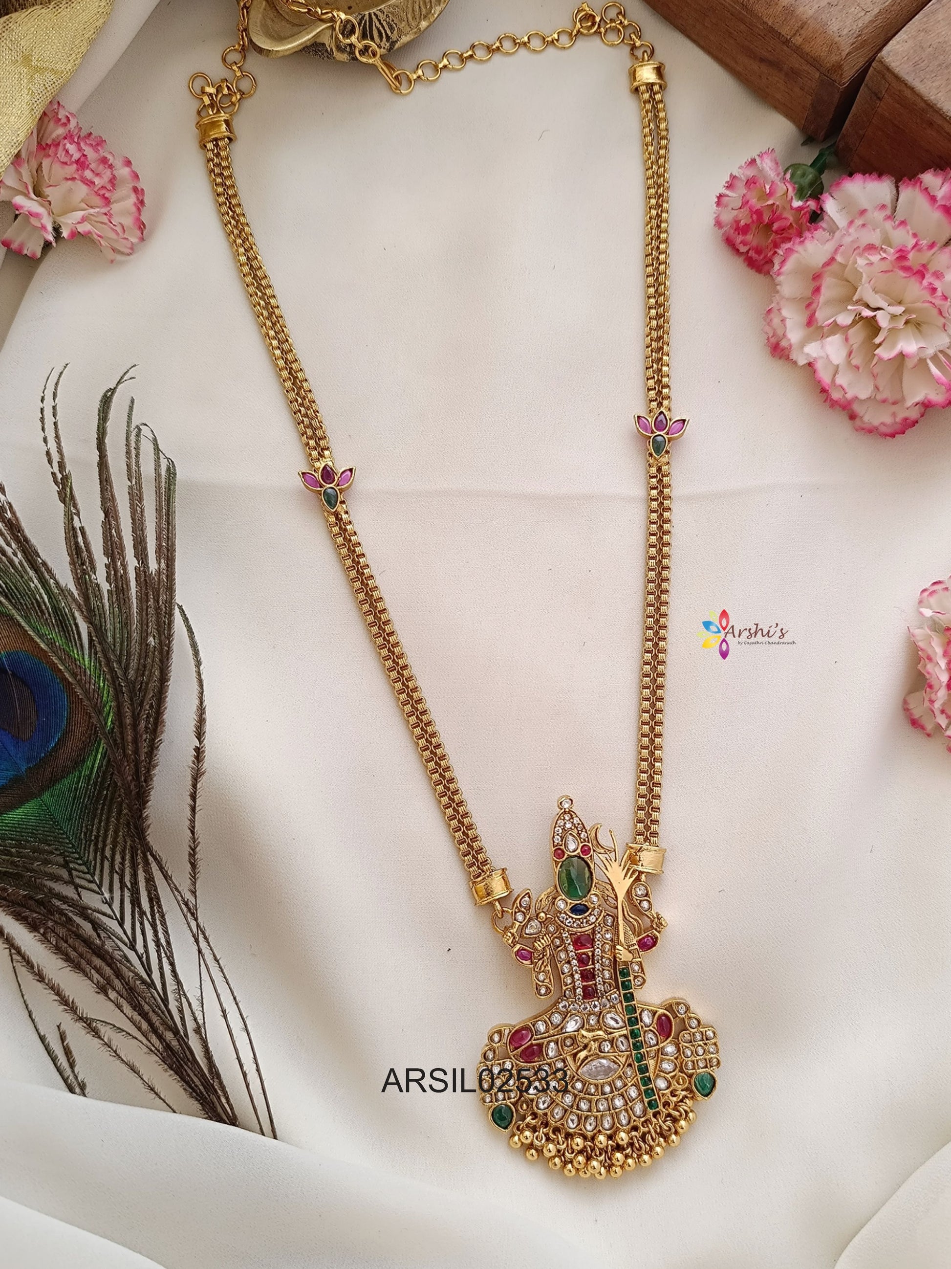 Divine Kamakshi Pendant Haram featuring antique temple design, intricate craftsmanship, and traditional motifs. Perfect for bridal or festive wear, it pairs beautifully with silk sarees for a timeless, regal look.