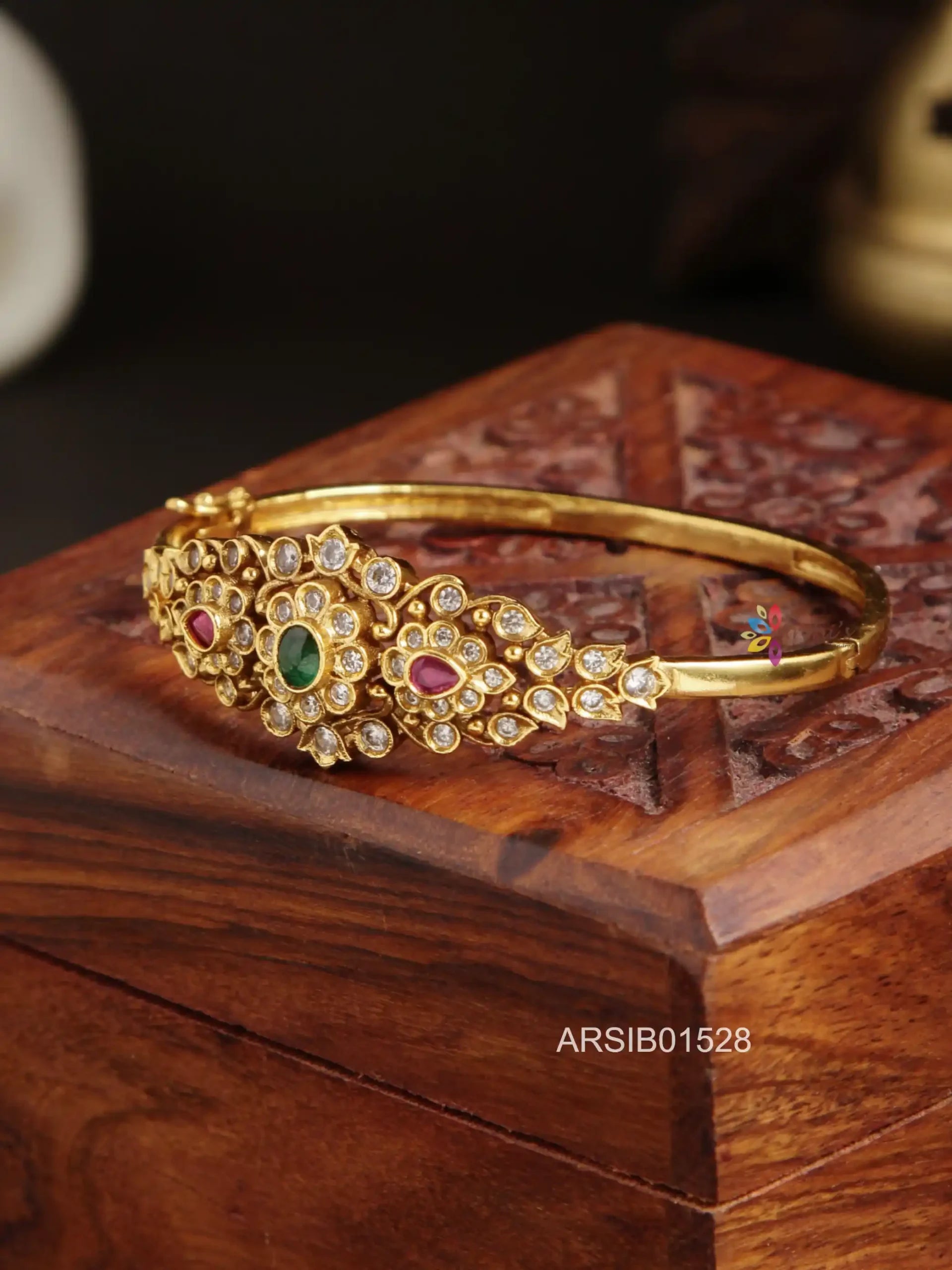 Elevate your style with our Kemp and AD Stone Bracelet Bangle. This stunning piece features vibrant Kemp stones and sparkling American Diamonds, meticulously set in an intricate design. Perfect for any special occasion, it adds a touch of glamour and tradition to your look.
