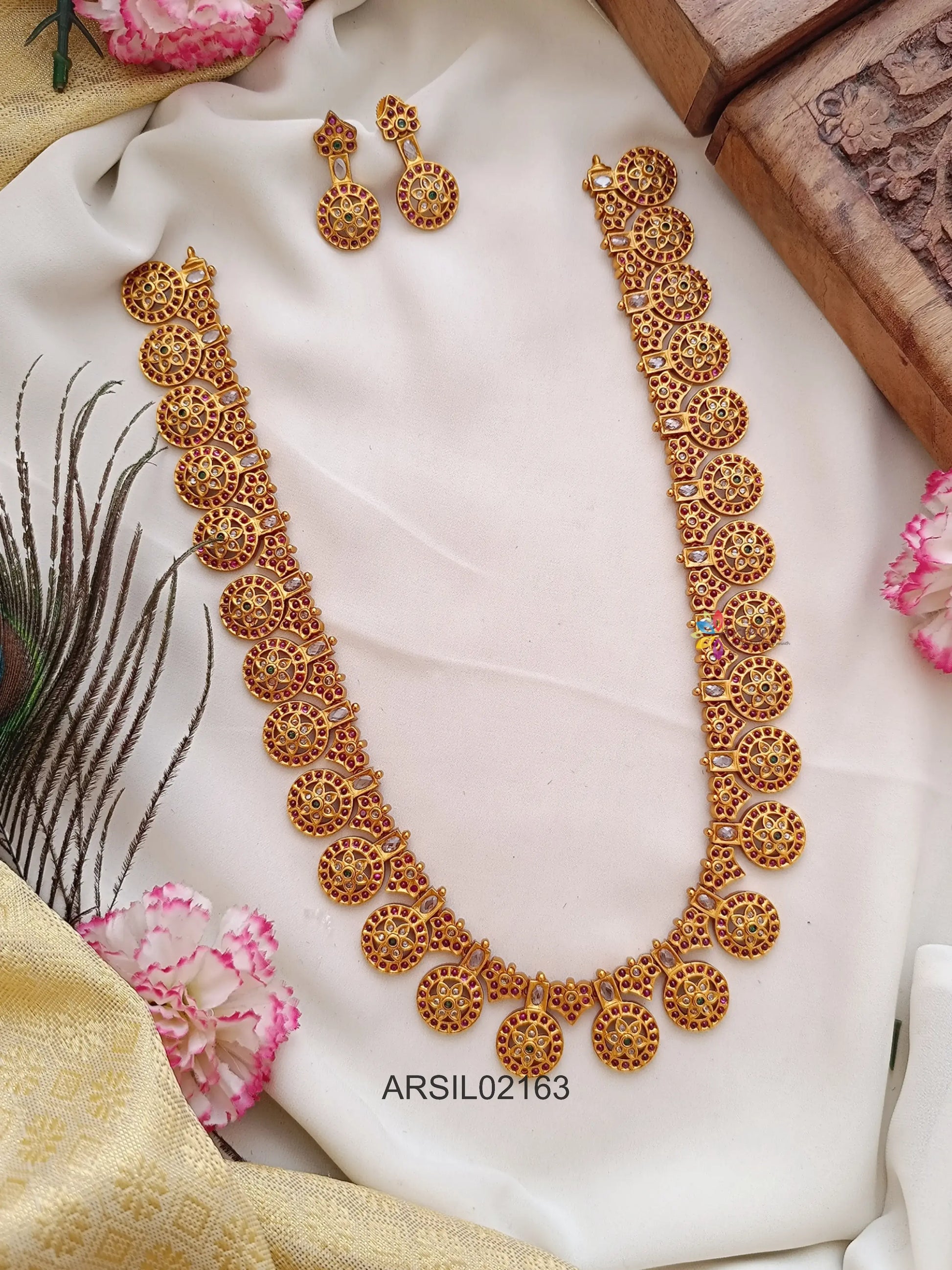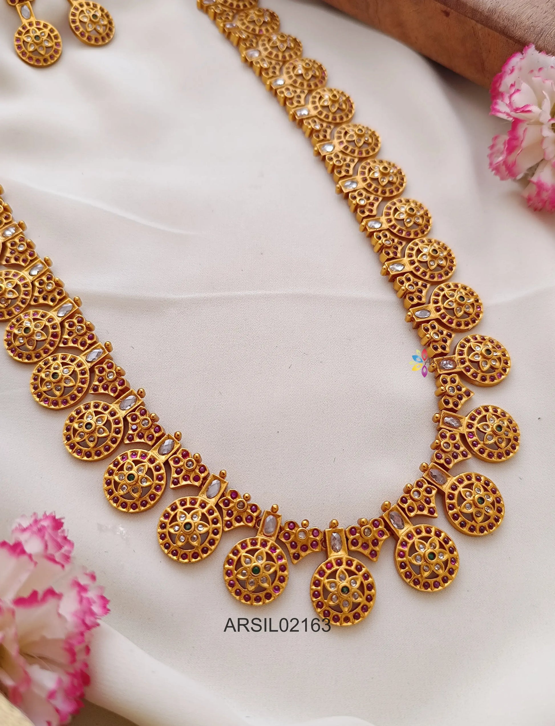 The Kemp Stone Bottumala Haram is a traditional masterpiece featuring rich red kemp stones set in intricate patterns. Its layered design and antique gold finish bring a regal charm to any ethnic ensemble.