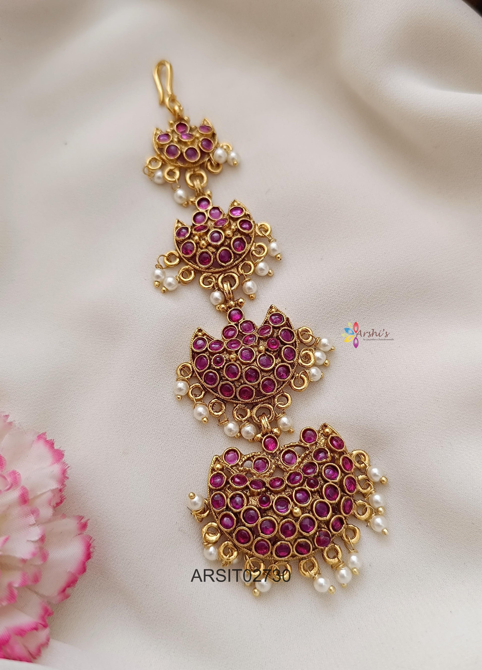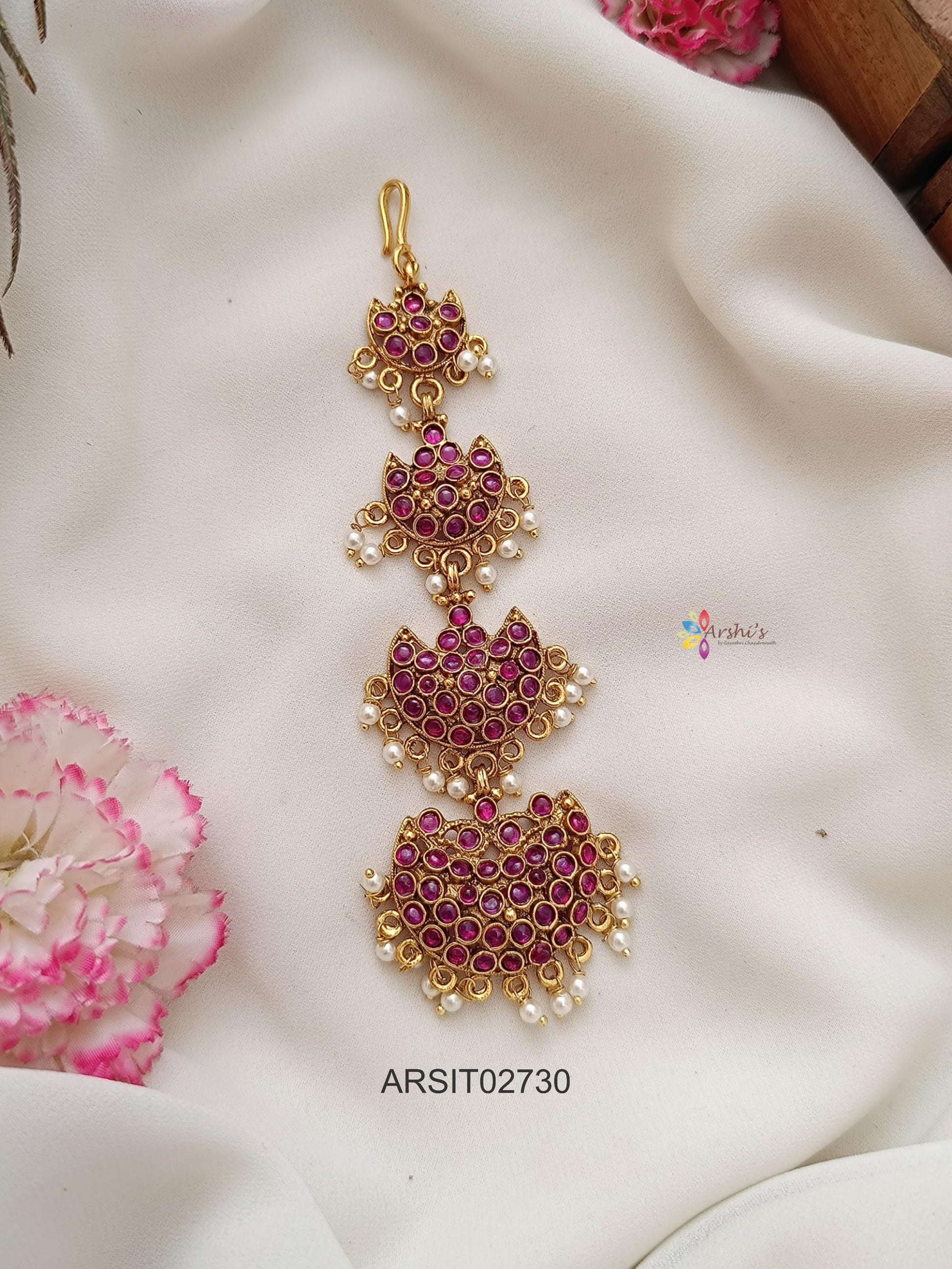 Add timeless elegance with this Kemp Stone Maangtikka, crafted with traditional red and green Kemp stones in a classic temple jewellery style. Perfect for weddings and festivals, it beautifully complements silk sarees and lehengas.