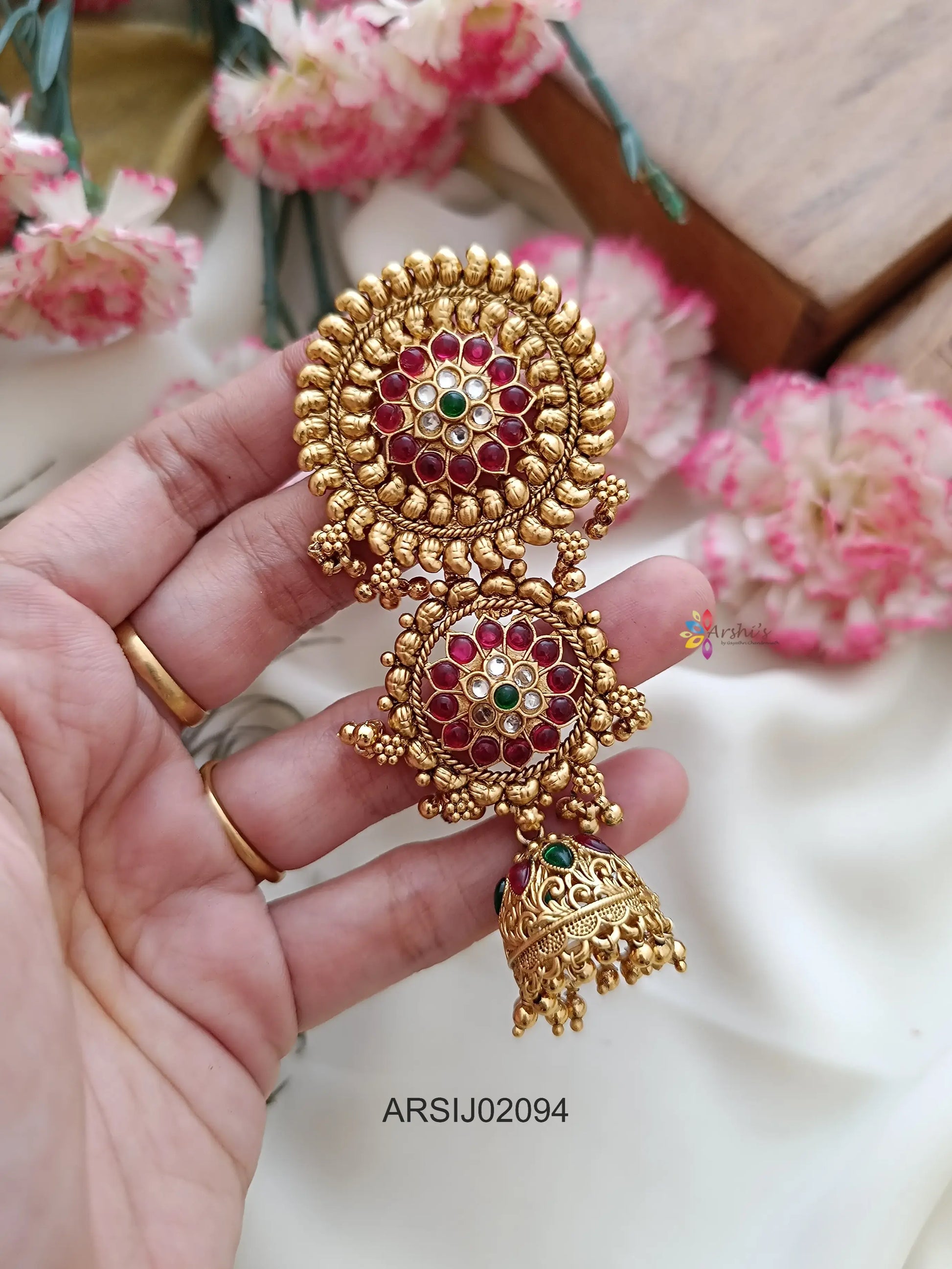 This Kemp stone three-step hair brooch features traditional red and green stones set in a cascading design. A perfect accessory for bridal and festive hairstyles, it brings a regal South Indian touch to your look.