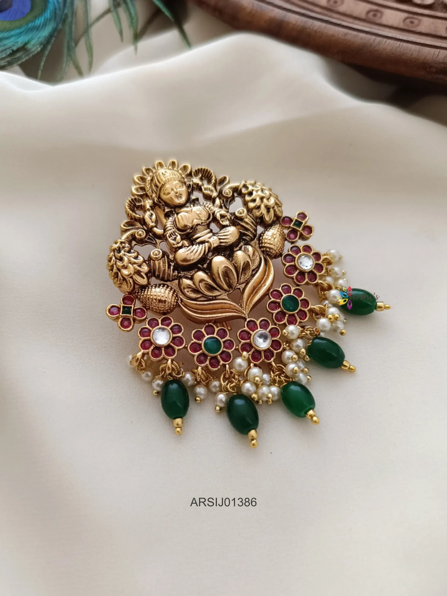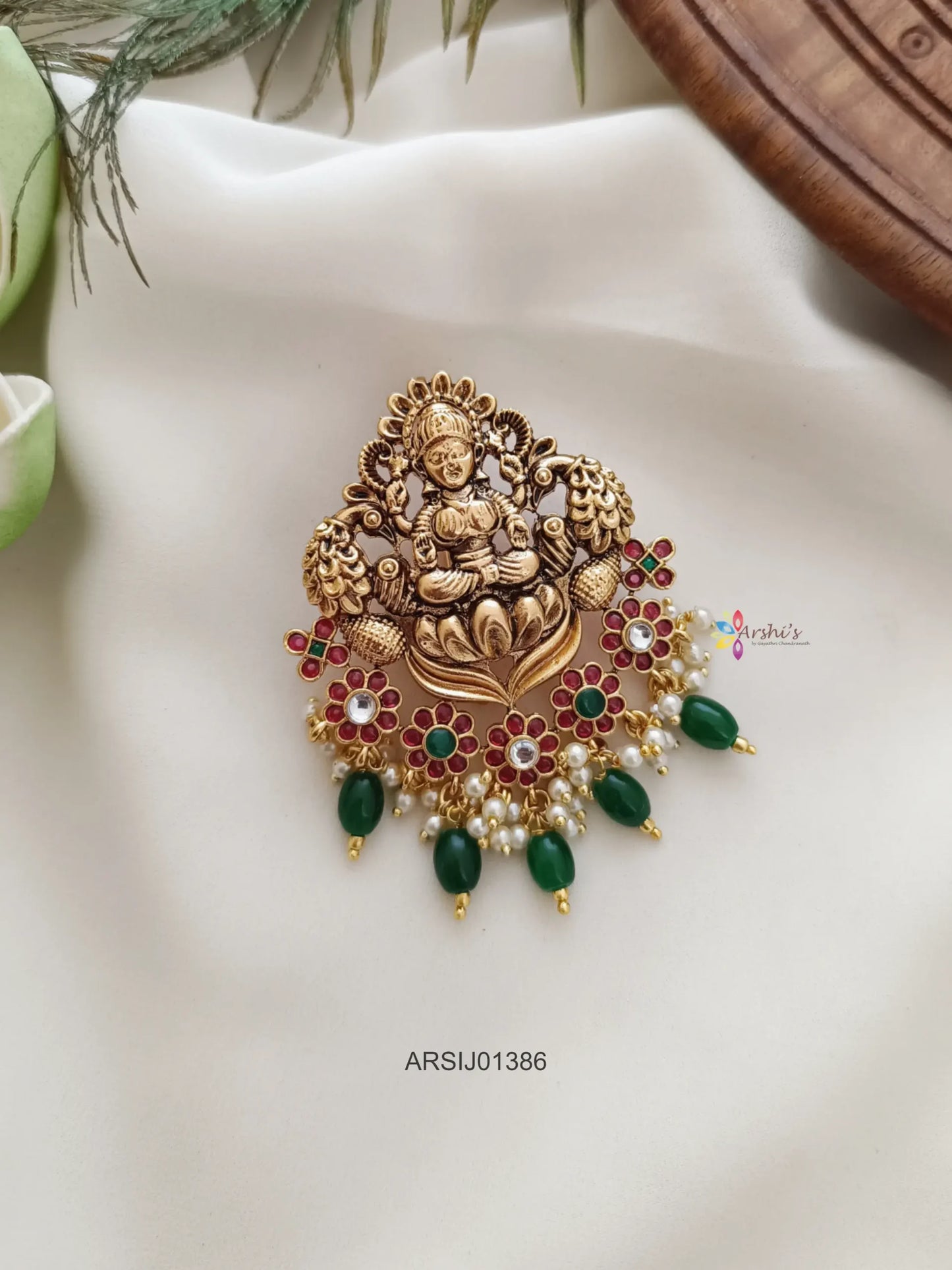 Embrace divine beauty with our Lakshmi Flower Design Green Bead Hair Brooch. Featuring the graceful form of Lakshmi intertwined with intricate floral motifs and adorned with vibrant green beads, this accessory radiates elegance and spiritual charm. Perfect for weddings, festivals, or cultural events, it adds a touch of sacred allure to any hairstyle, making you stand out with graceful sophistication.