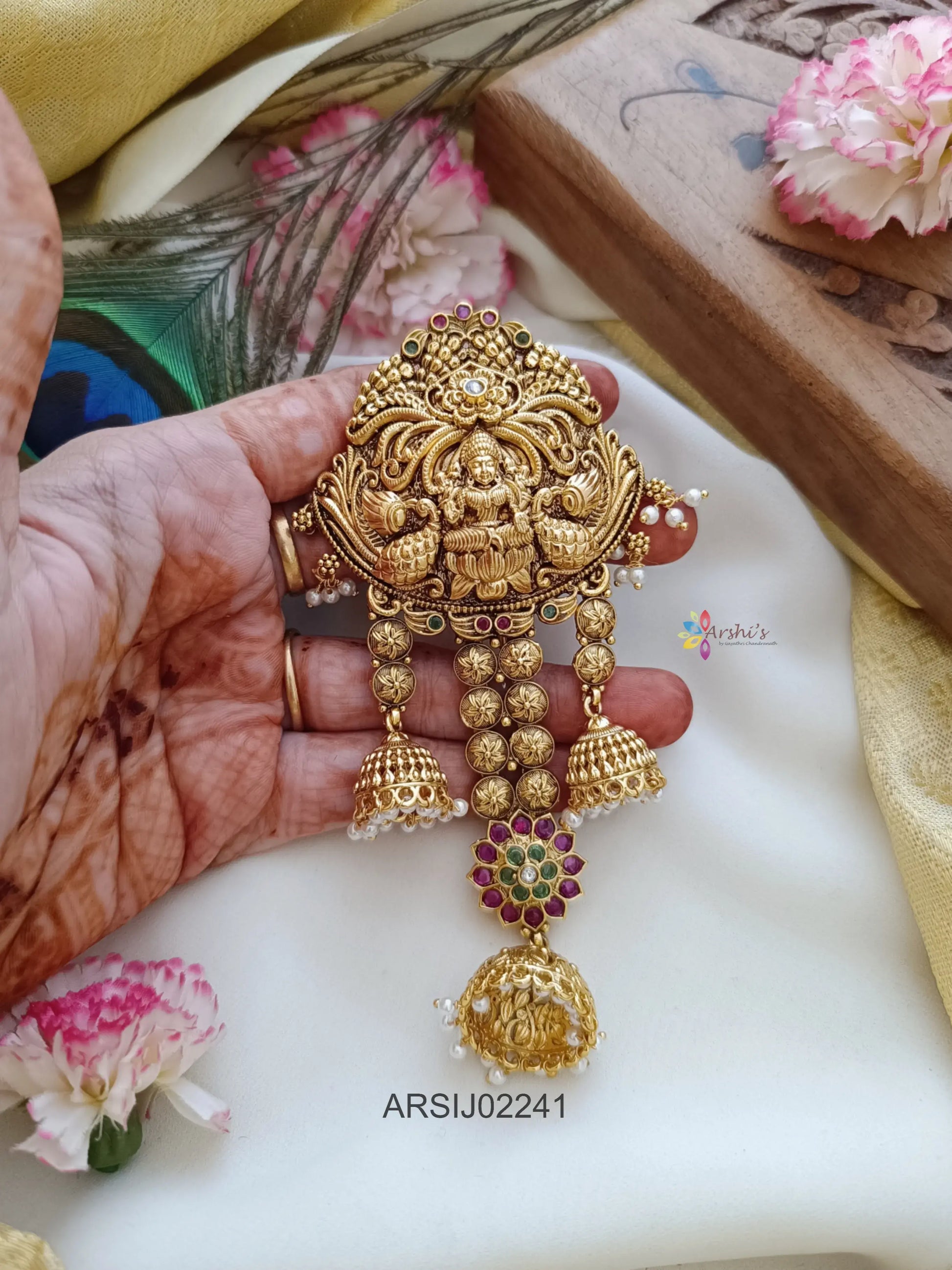 Lakshmi Peacock Jhumki Pearl Drop Hairbrooch features a central Lakshmi motif with peacock designs and delicate jhumki-style pearl drops. Perfect for weddings and festivals, it adds a graceful traditional touch to hairstyles.