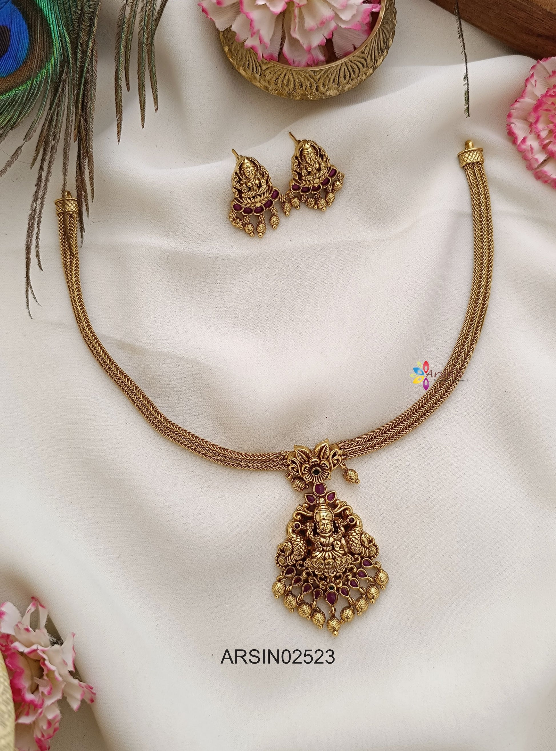 The Lakshmi Pendant Attigai Necklace exudes divine elegance with its intricately crafted goddess Lakshmi pendant. Accented with classic gold tones and traditional motifs, it perfectly complements temple wear, bridal sarees, and festive looks.