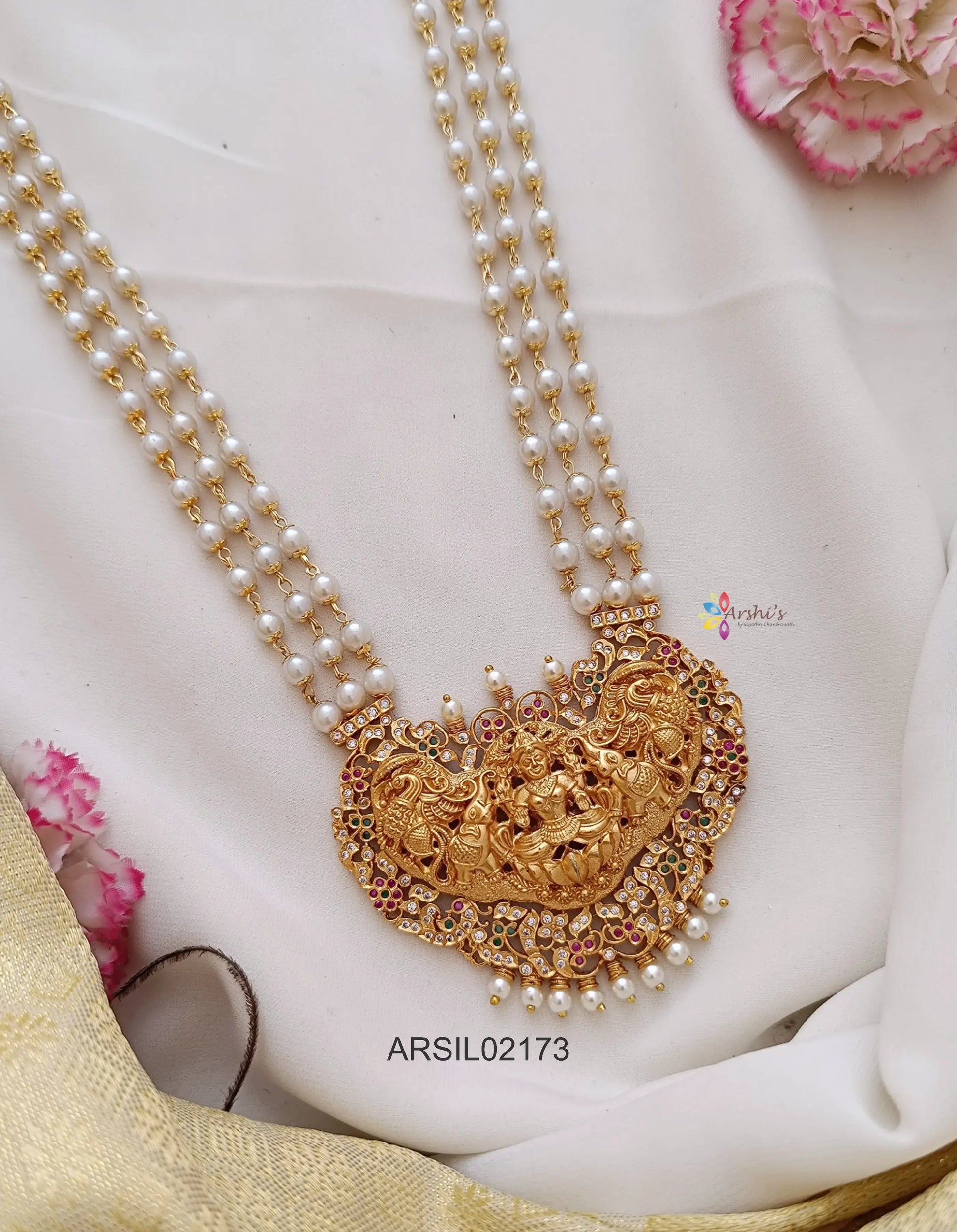 The Lakshmi Pendant Three Layer Pearl Haram is a divine blend of tradition and elegance. Featuring three graceful layers of pearls and a detailed Lakshmi pendant, it radiates timeless beauty and grace.