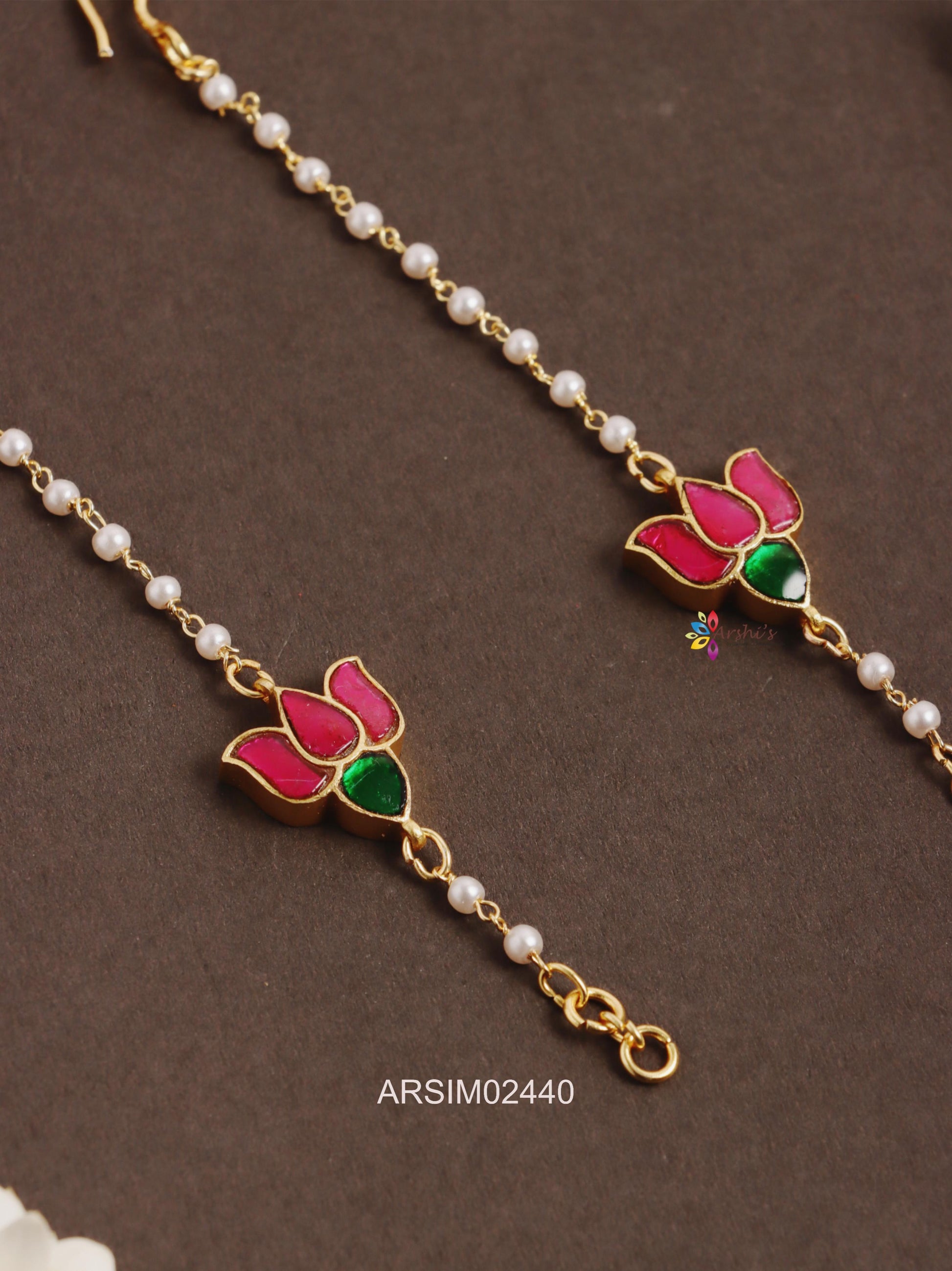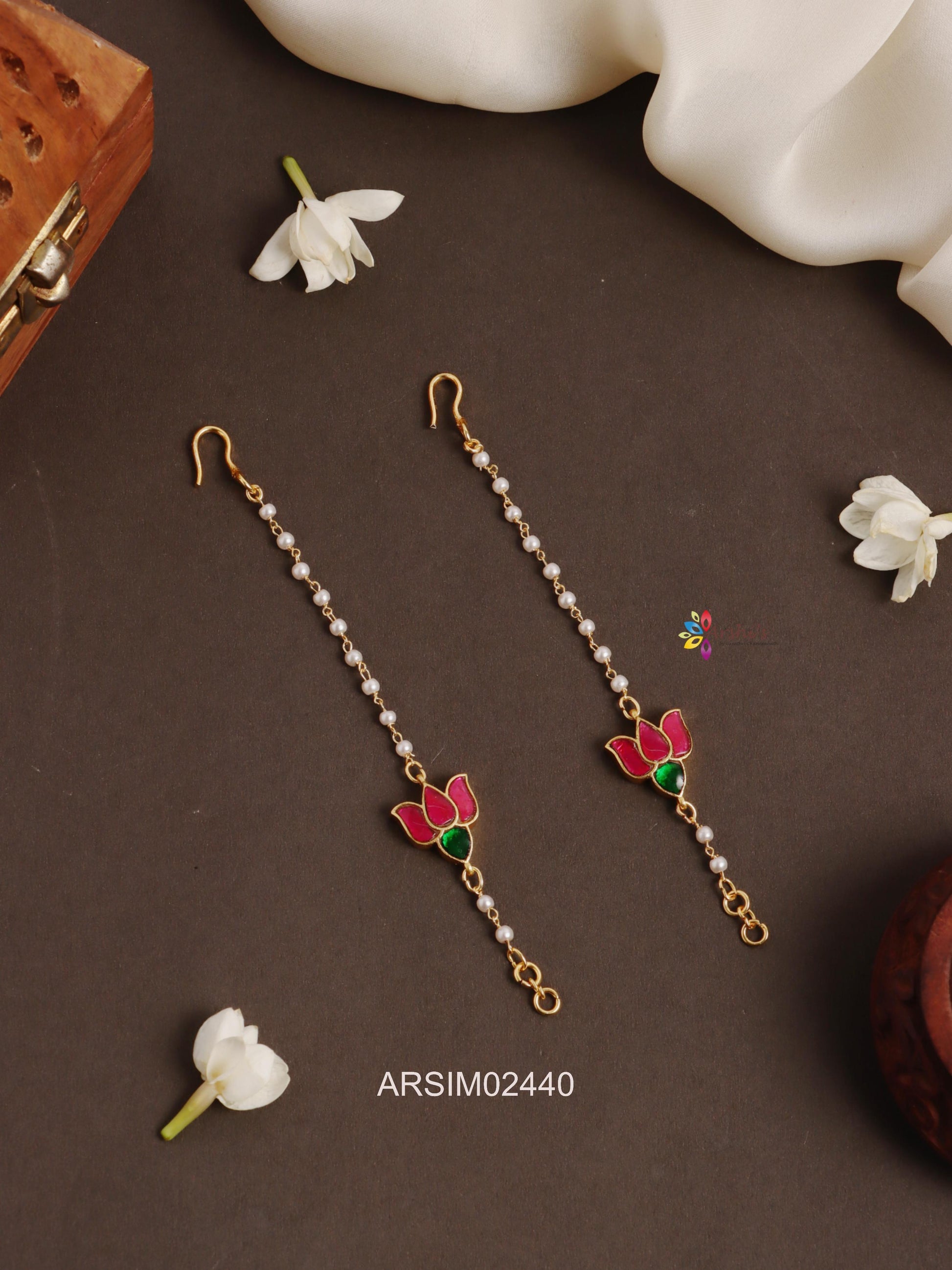 Beautiful earchains featuring lotus motifs adorned with vibrant kemp stones and delicate green pearls. A charming traditional accessory, perfect for enhancing bridal looks, festive wear, and elegant South Indian ensembles.