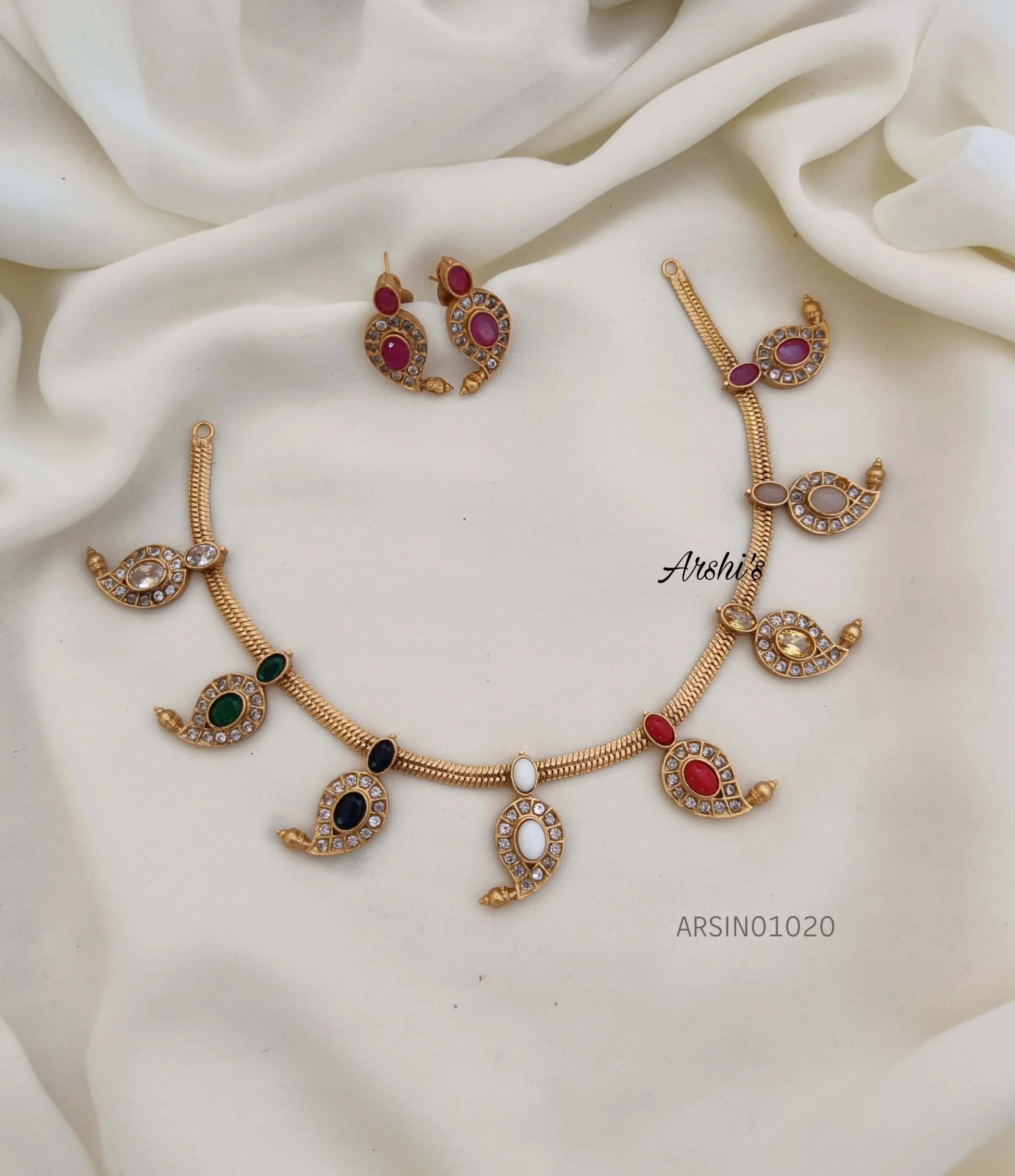 A Mango Design Navarathna Stone Necklace is a traditional Indian necklace known for its exquisite design featuring a pendant in the shape of a mango and adorned with Navarathna stones. Navarathna stones are a set of nine gemstones that are considered highly auspicious in Hindu astrology and are believed to bring good luck and positive energy.