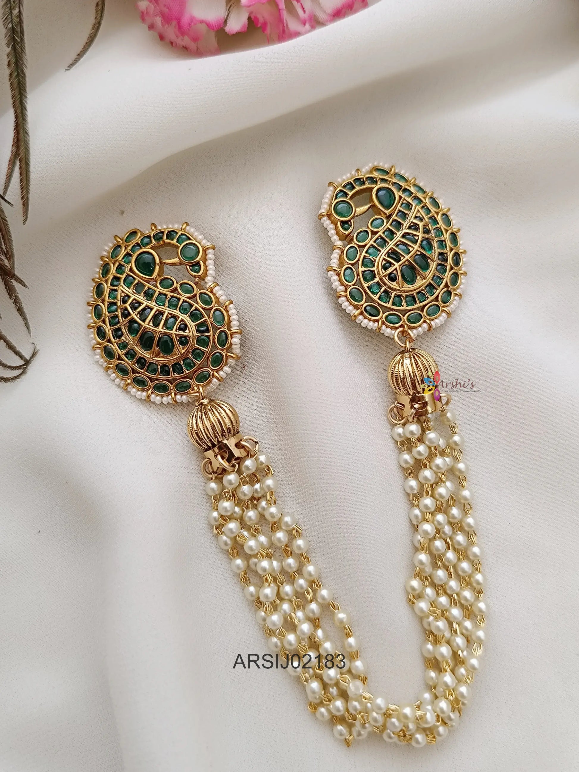 The Mango Emerald Stone Pearl Layer Hair Brooch beautifully blends tradition and sophistication. Featuring vibrant emerald stones, classic mango motifs, and delicate pearl layers, it’s a perfect accessory for weddings and festive occasions.
