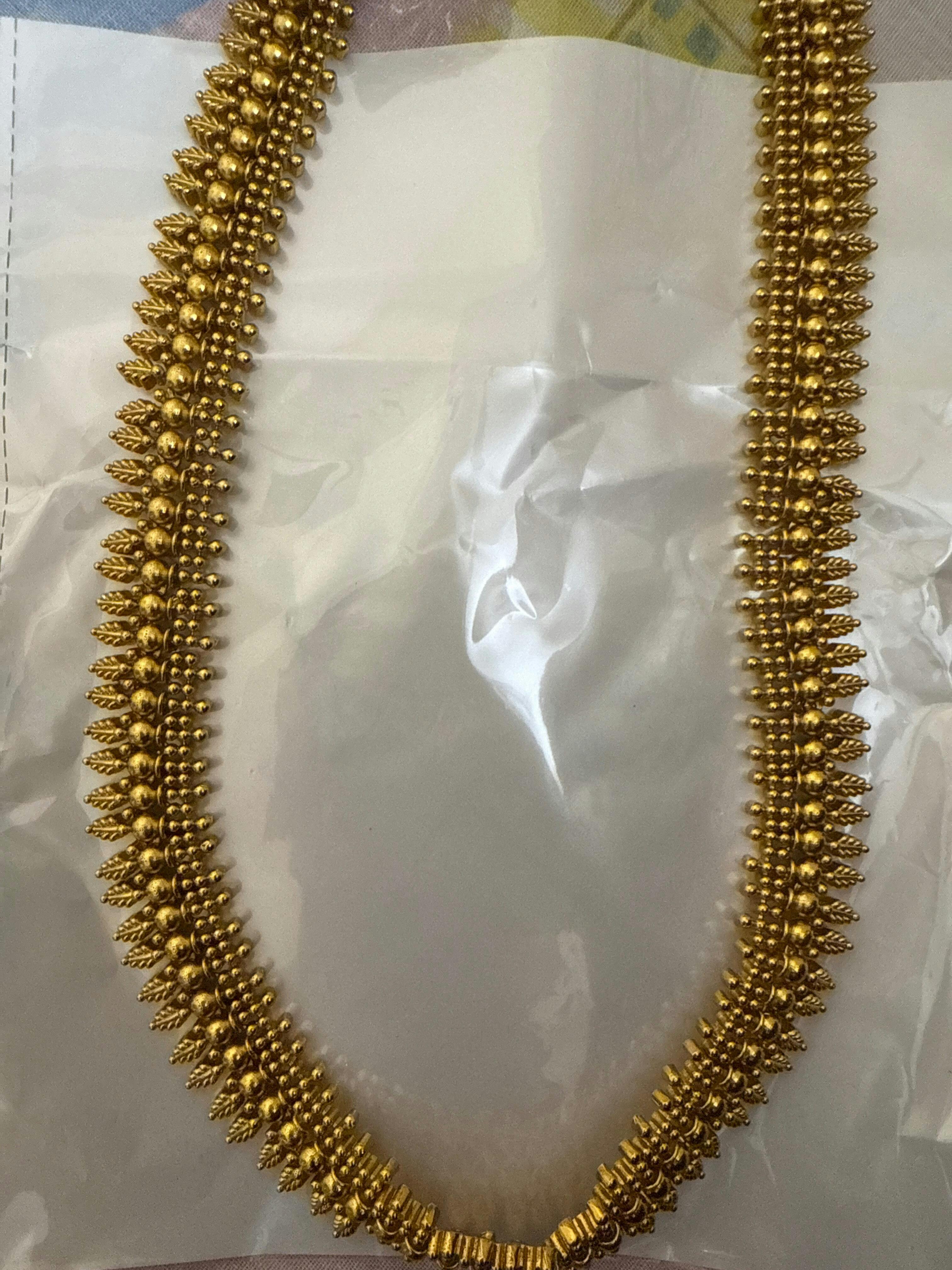 This Matte Finish Long Haram boasts a graceful antique look with intricately crafted motifs and a subtle gold tone. Ideal for weddings or temple wear, it radiates timeless elegance and heritage charm.
