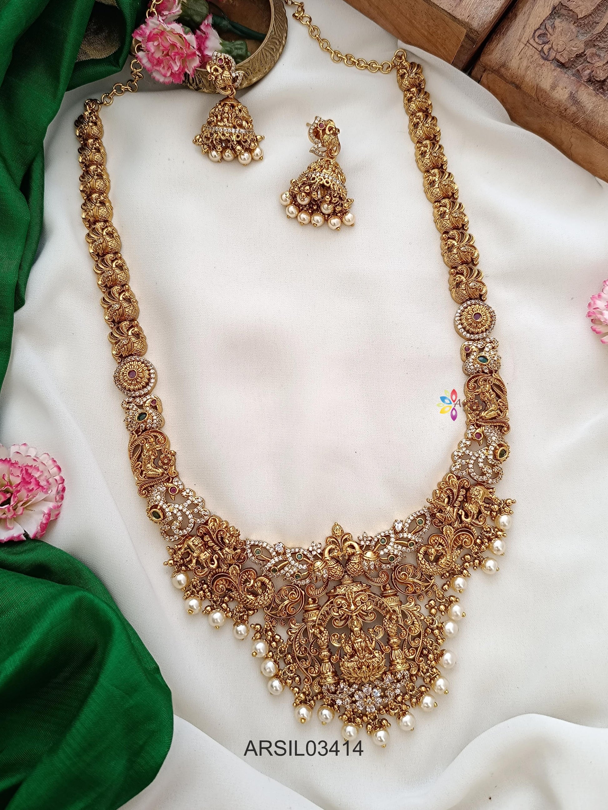 Elegant matte temple design long haram featuring intricate craftsmanship and traditional motifs. Its subtle finish exudes timeless charm, making it perfect for weddings, poojas, and festive ethnic looks.