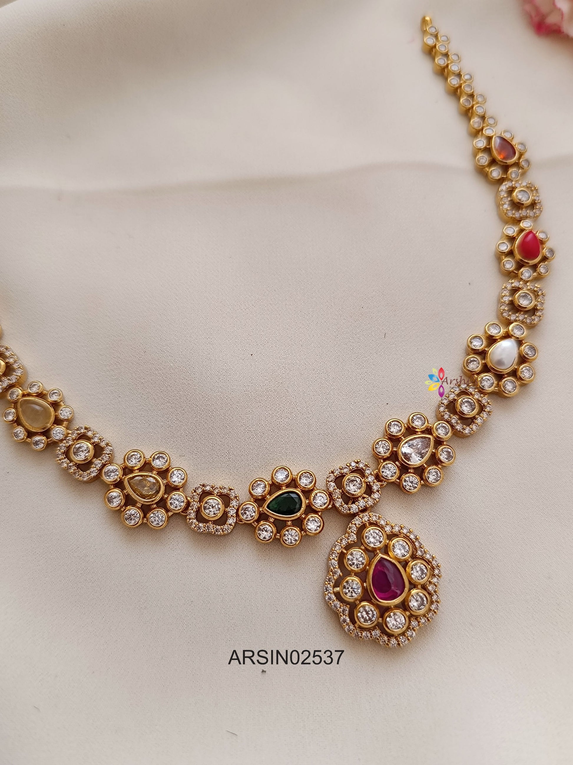 Elegant Navarathna Stone Necklace featuring nine vibrant gemstones symbolizing prosperity and positivity. Perfect for traditional outfits, this timeless piece blends heritage charm with colorful grace, making it ideal for festive and bridal occasions.