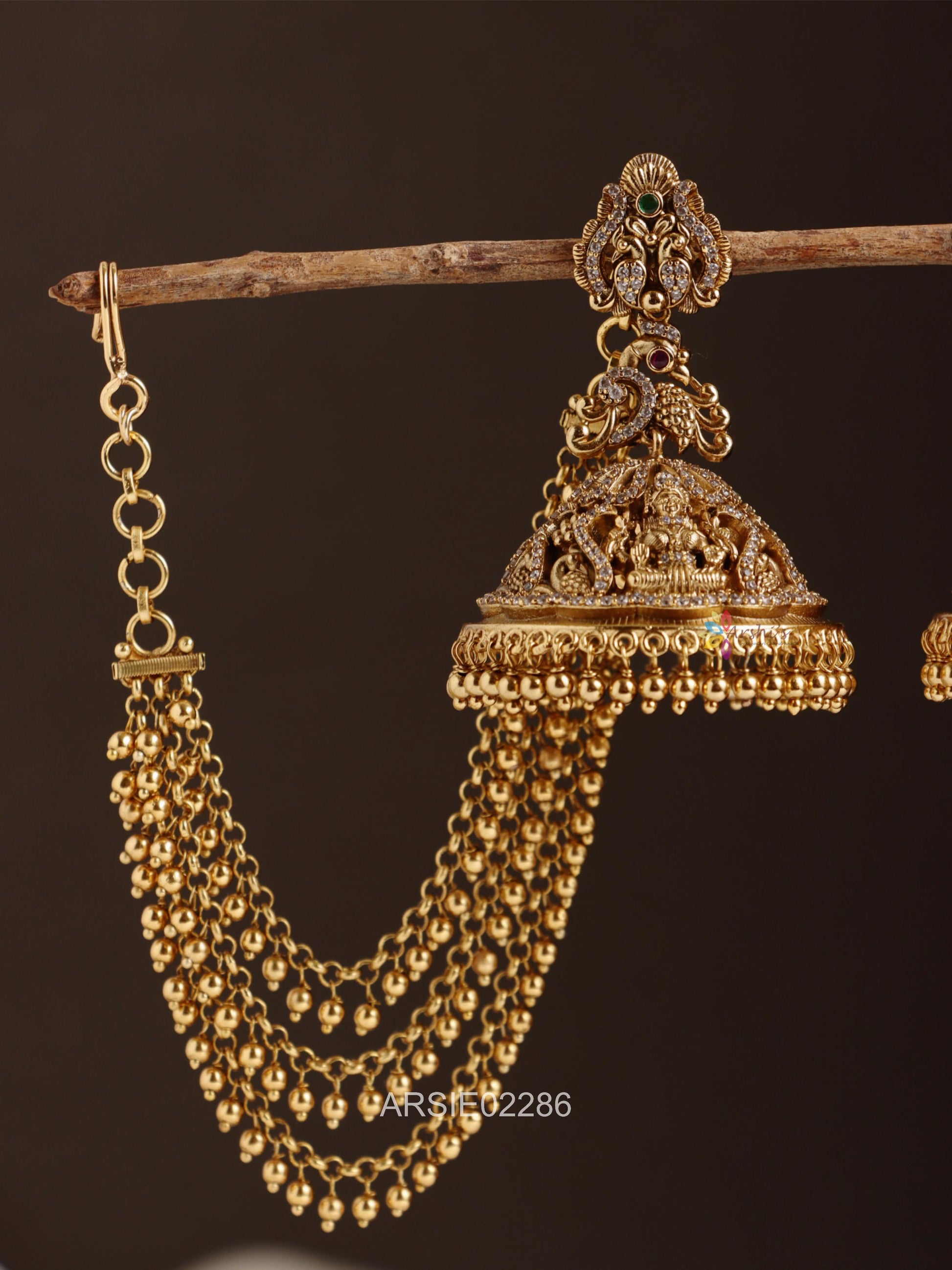 Peacock and Lakshmi Design Jhumka with Earchains
