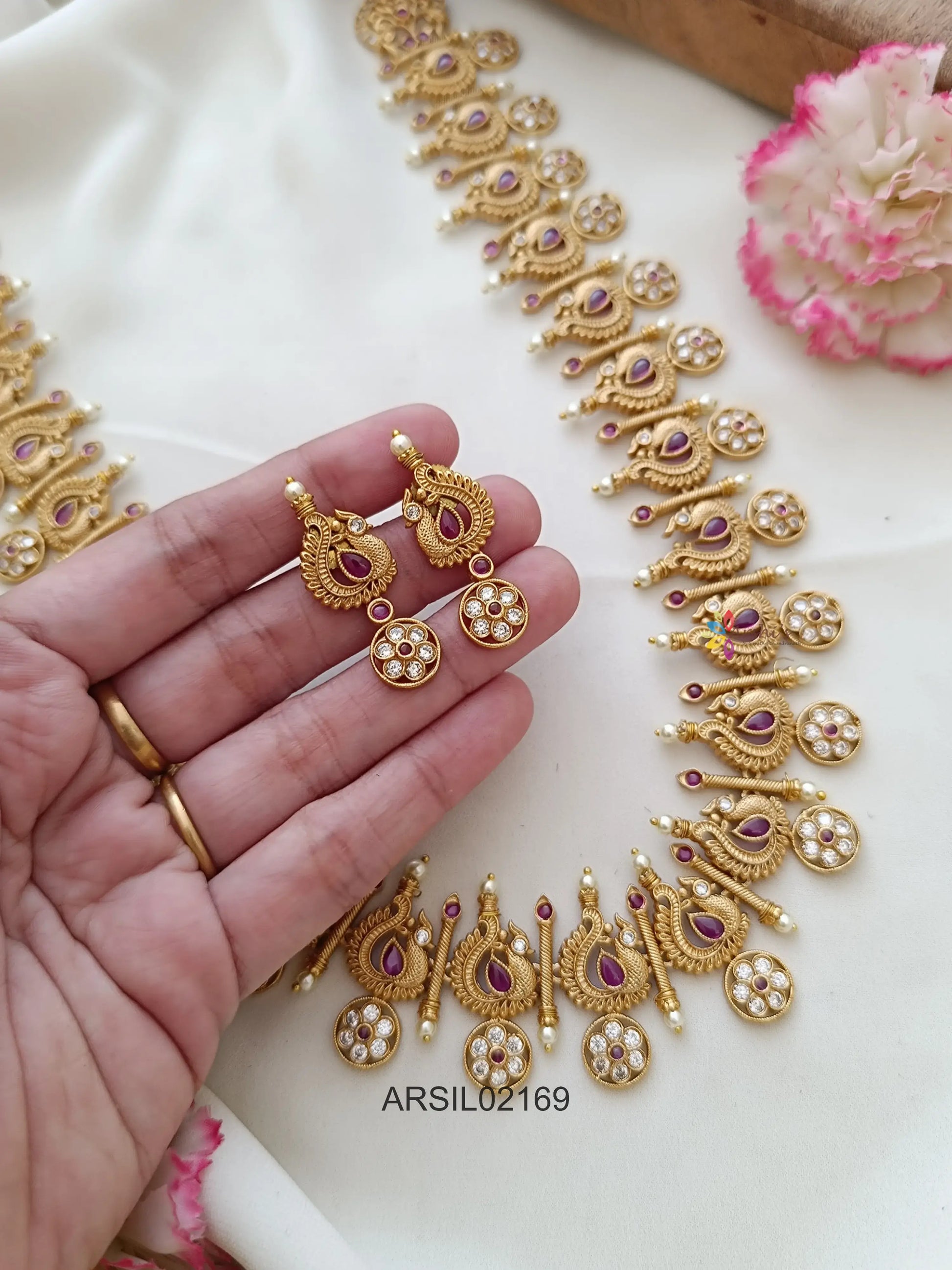 The Peacock Design Bottumala Haram features exquisite peacock motifs paired with delicate beads, creating a regal look. This traditional piece adds a rich, vibrant touch to any festive or bridal ensemble.