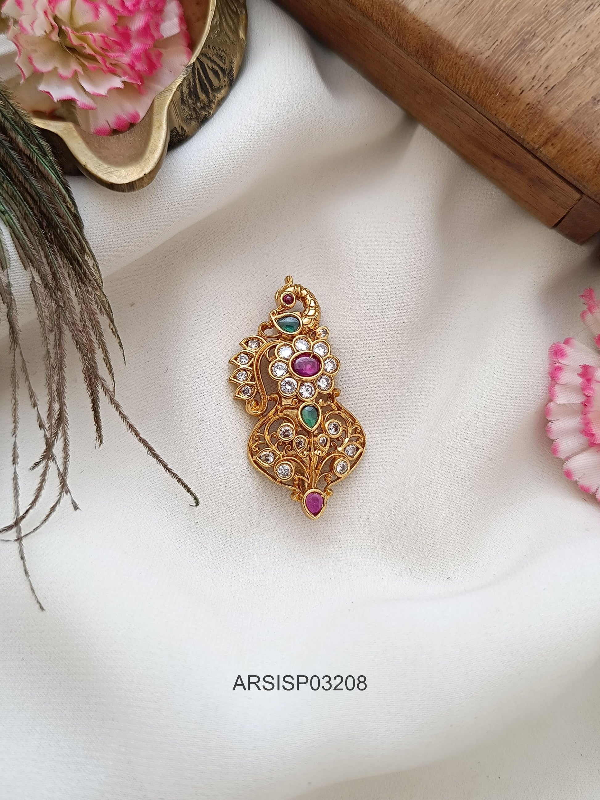 Elegant peacock flower stone saree pin adorned with shimmering stones, featuring intricate peacock and floral motifs, crafted to add traditional charm, vibrant sparkle, and a graceful accent to silk sarees.