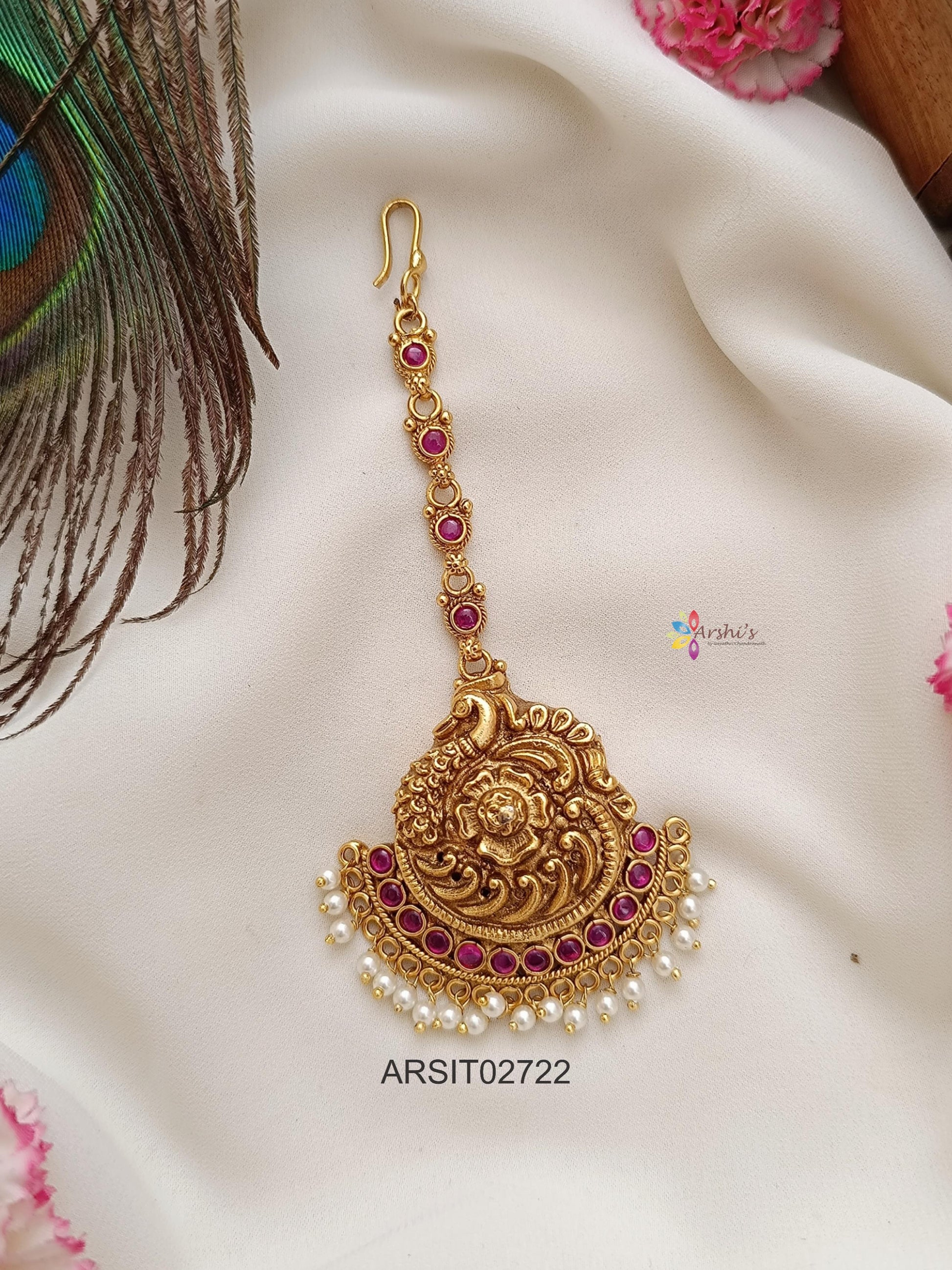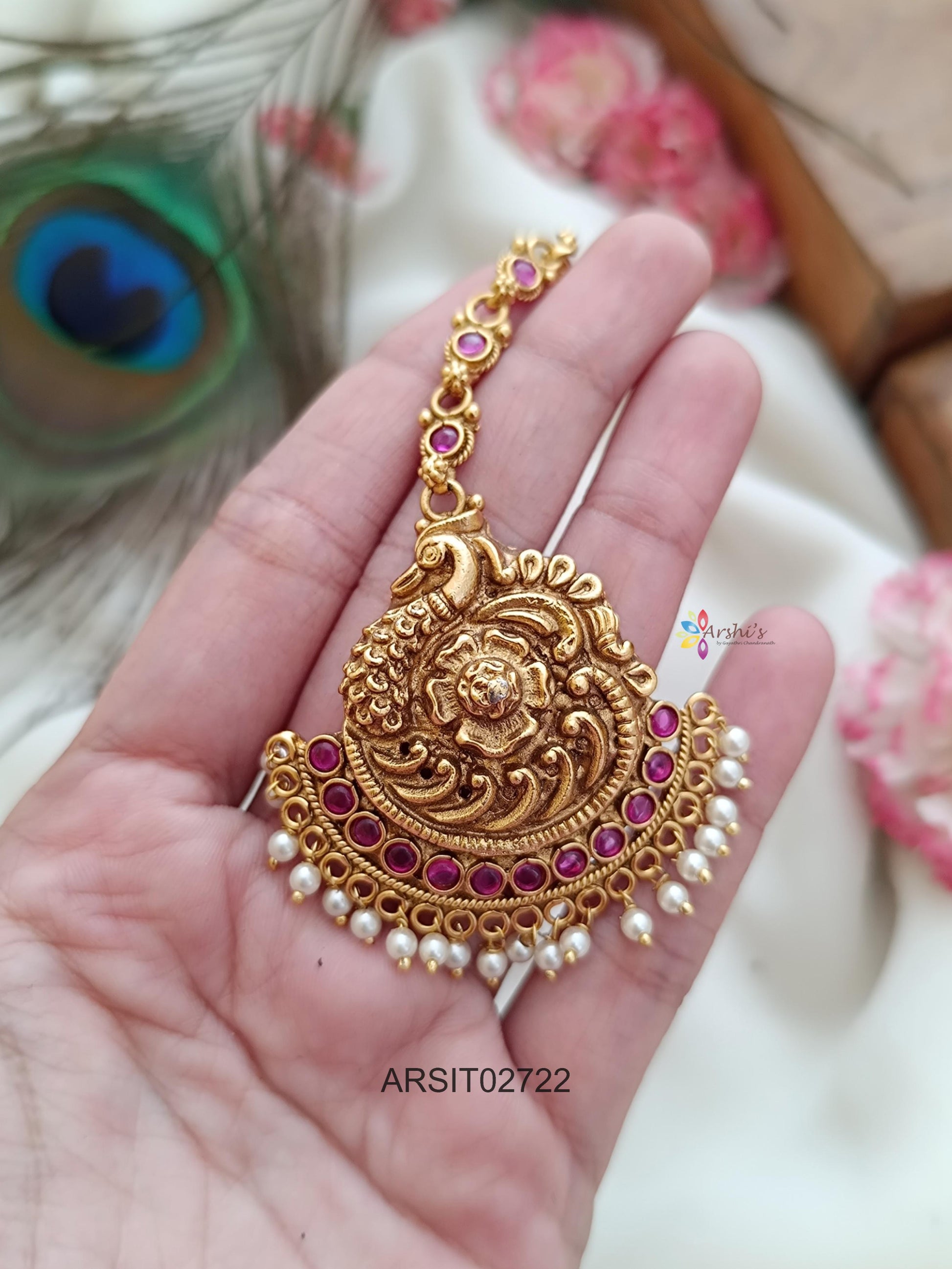 Add elegance to your look with this stunning Peacock Maangtikka, featuring intricate temple design, vibrant stones, and gold finish. Perfect for weddings, festivals, and traditional wear, it enhances every bridal and festive outfit.