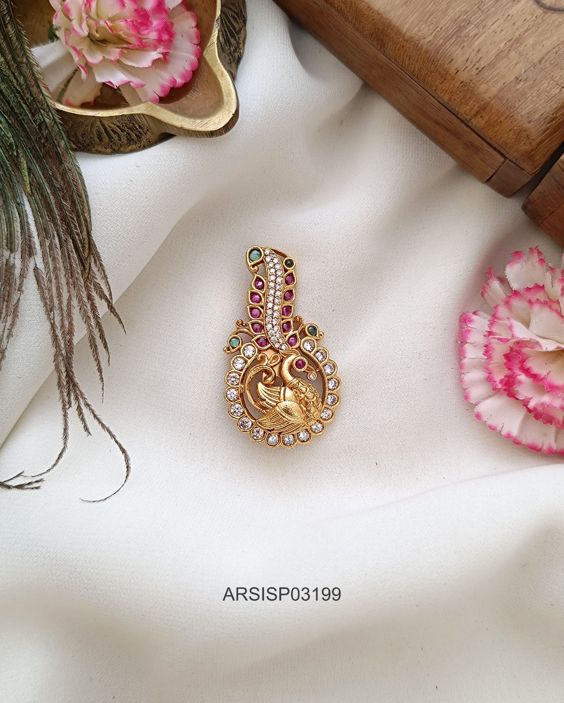 Elegant peacock saree pin embellished with vibrant multi stones, crafted to add colourful brilliance, traditional charm, and a striking accent to silk sarees and festive Indian ensembles.