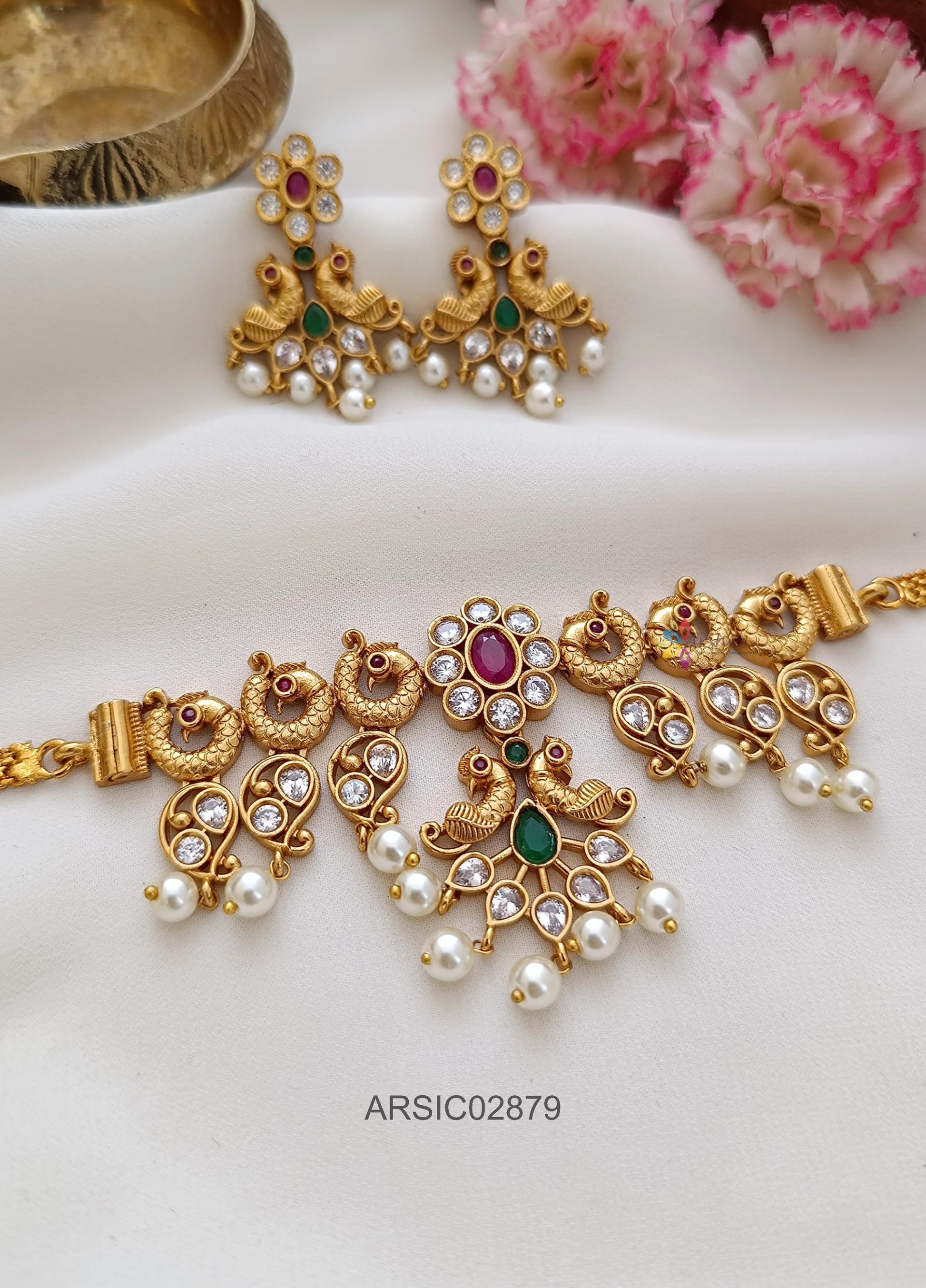 Elegant Peacock Pearl Choker featuring intricate peacock motifs and lustrous pearls, blending traditional South Indian craftsmanship with timeless elegance—perfect for weddings, festive occasions, or bridal ensembles.