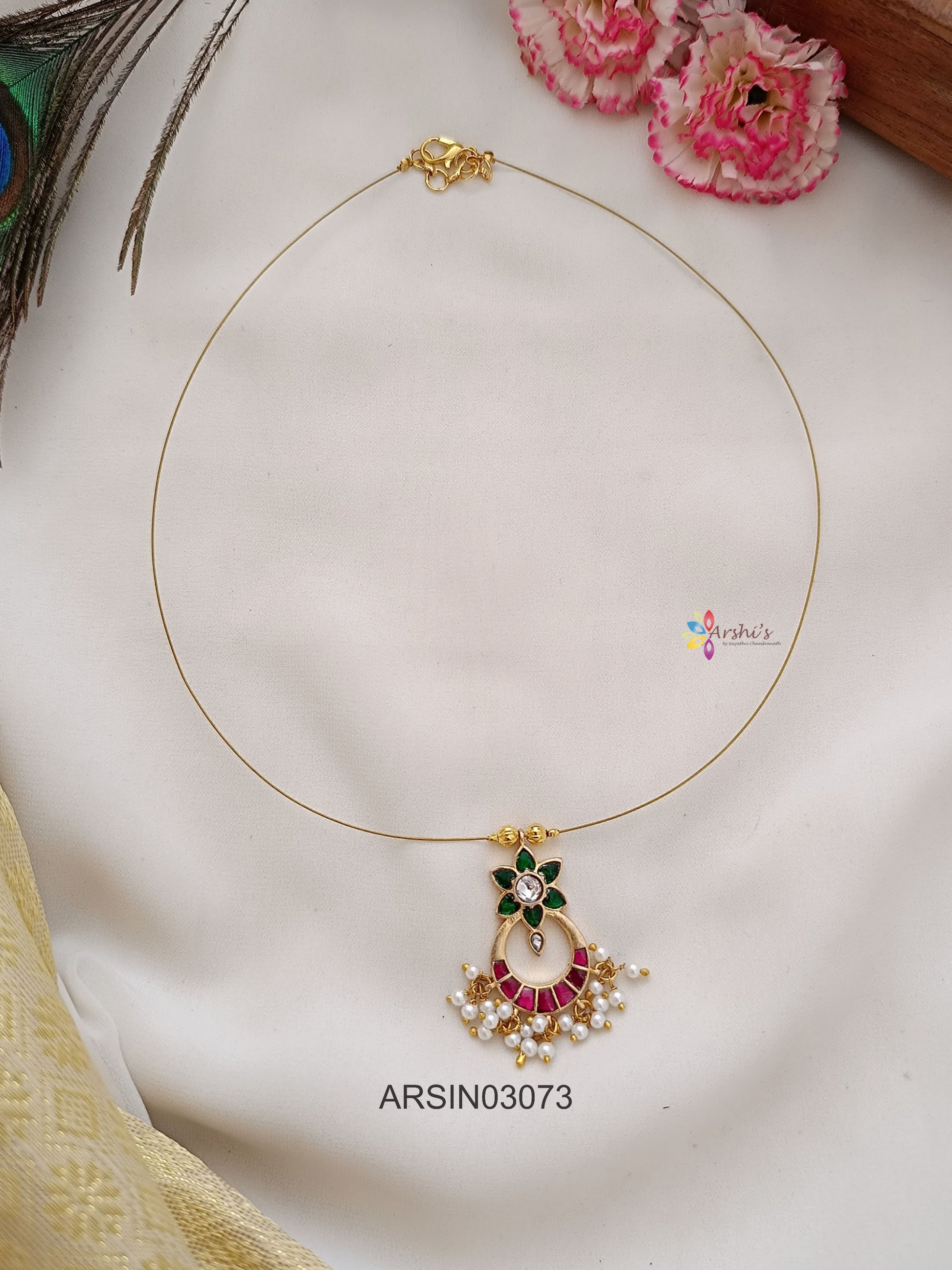 A stunning red and green Chandbali pendant necklace featuring invisible setting work, blending traditional charm with modern finesse. Its vibrant stones and elegant silhouette make it perfect for festive, bridal, or ethnic occasions.