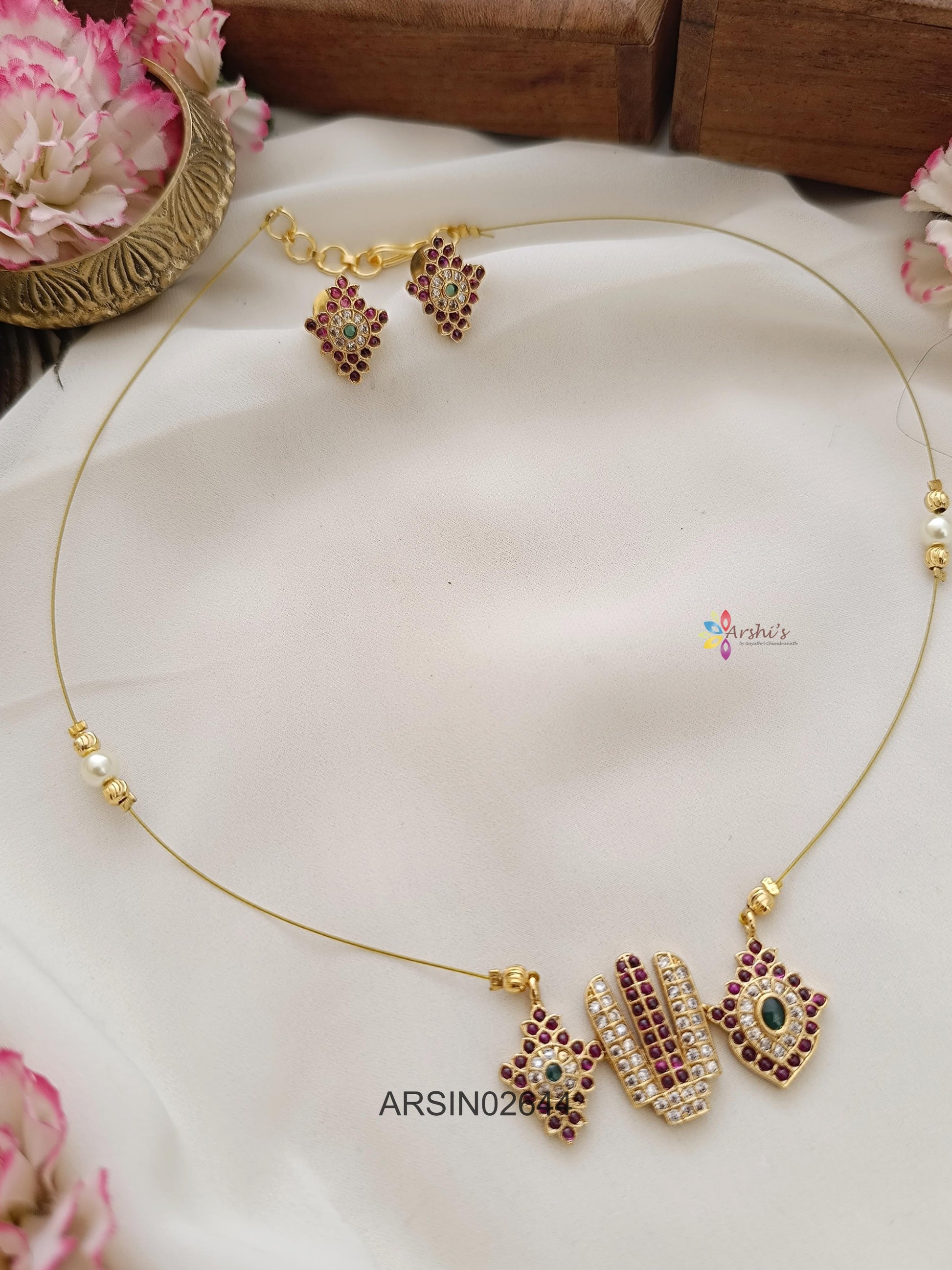 This Shanku Chakra Nama pendant invisible necklace radiates divine charm with its sacred symbols. Set on a transparent chain, it creates a floating effect, perfect for spiritual occasions, temple visits, and traditional festive wear.