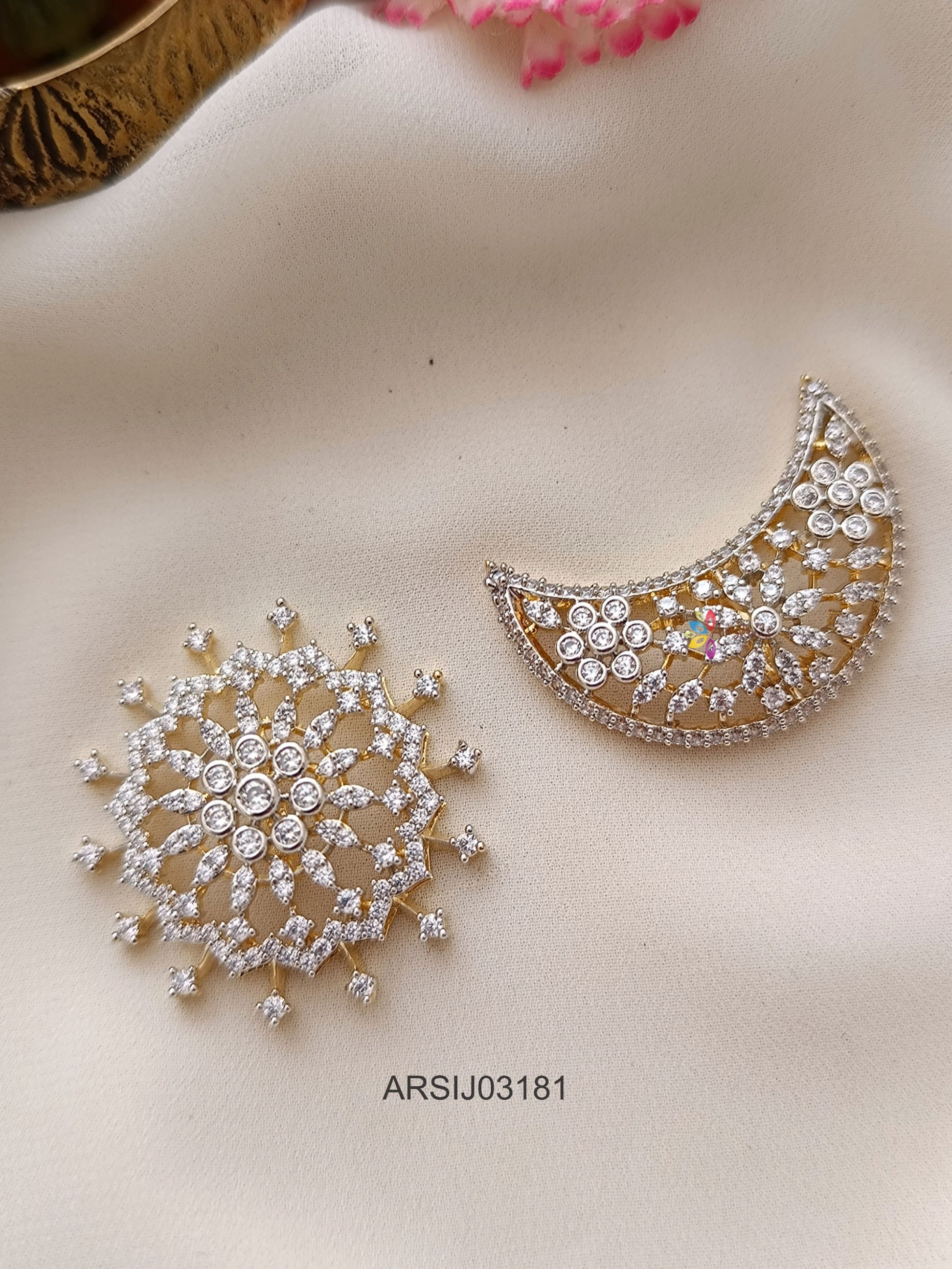 Graceful Surya Chandra white stone hair brooch featuring celestial sun and moon motifs, accented with shimmering stones, bringing divine elegance and traditional charm to bridal and festive hairstyles.