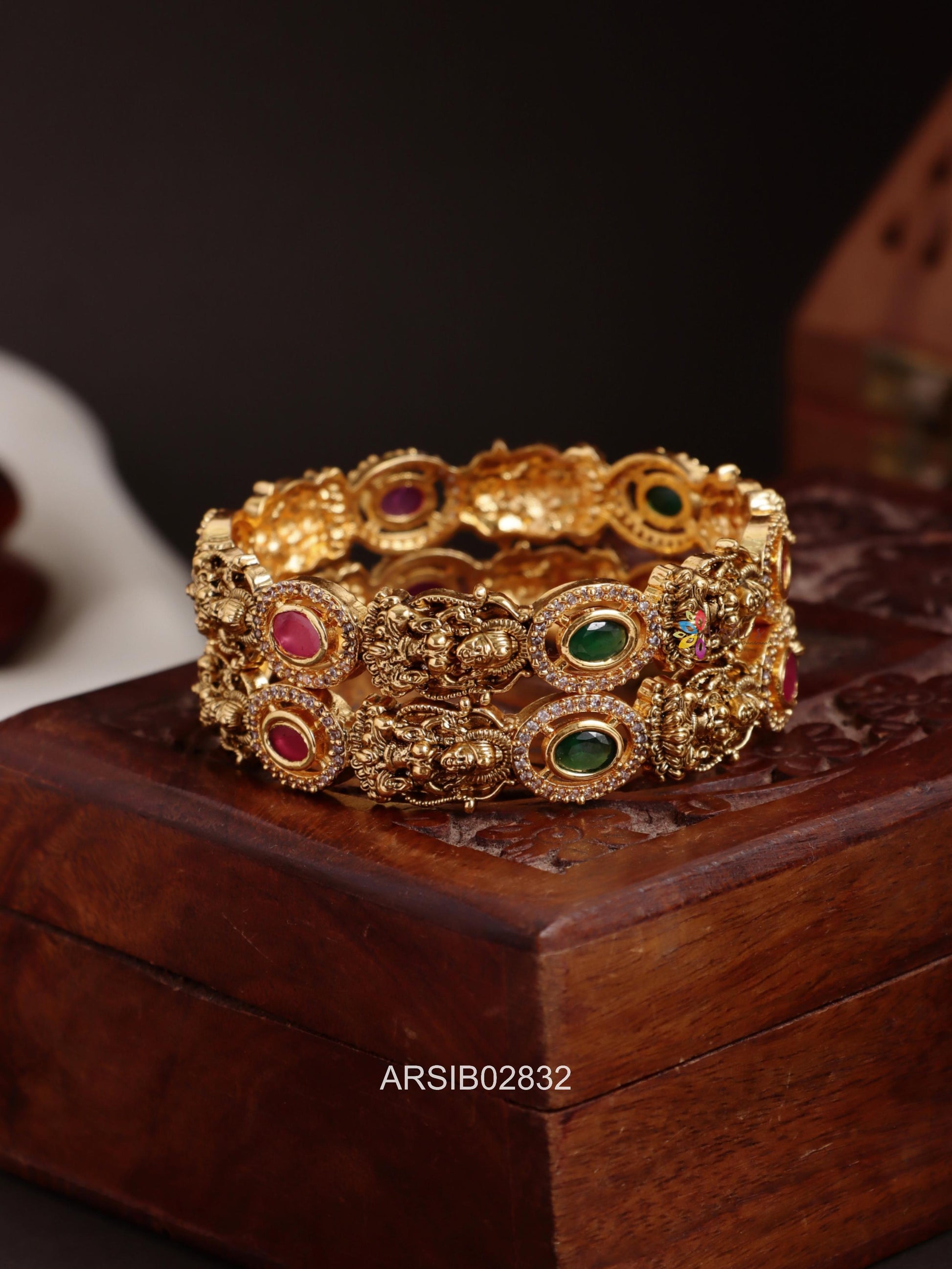 Stunning Temple Kemp and Green Bangles featuring traditional South Indian design. Adorned with vibrant kemp stones and intricate gold work, they’re perfect for weddings, festivals, or festive ethnic ensembles.