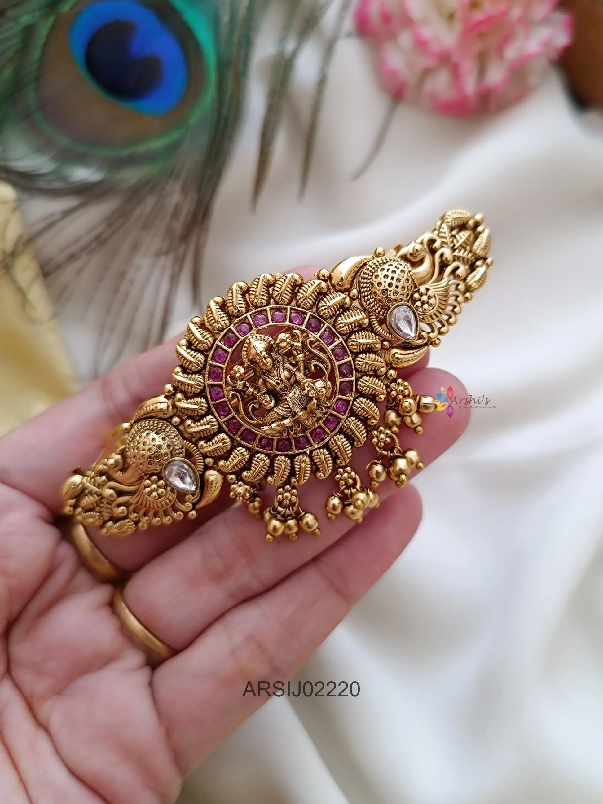 This exquisite Temple-style hairclip showcases a traditional mango motif adorned with radiant red and white Kemp stones. A perfect blend of elegance and heritage, it beautifully complements festive and bridal hairstyles.